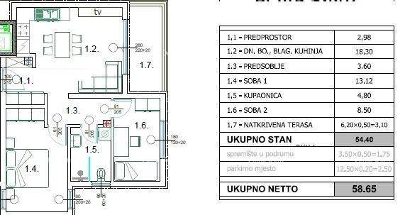 predprostora, dnevnog boravka s kuhinjom i blagovaonom, dvije spavaće sobe, kupaonice te terase.