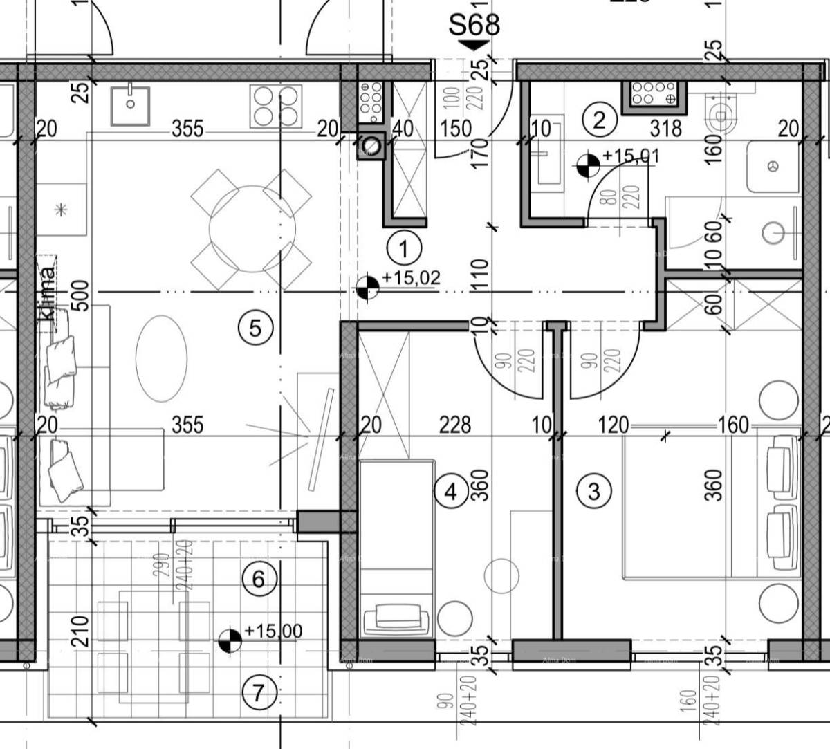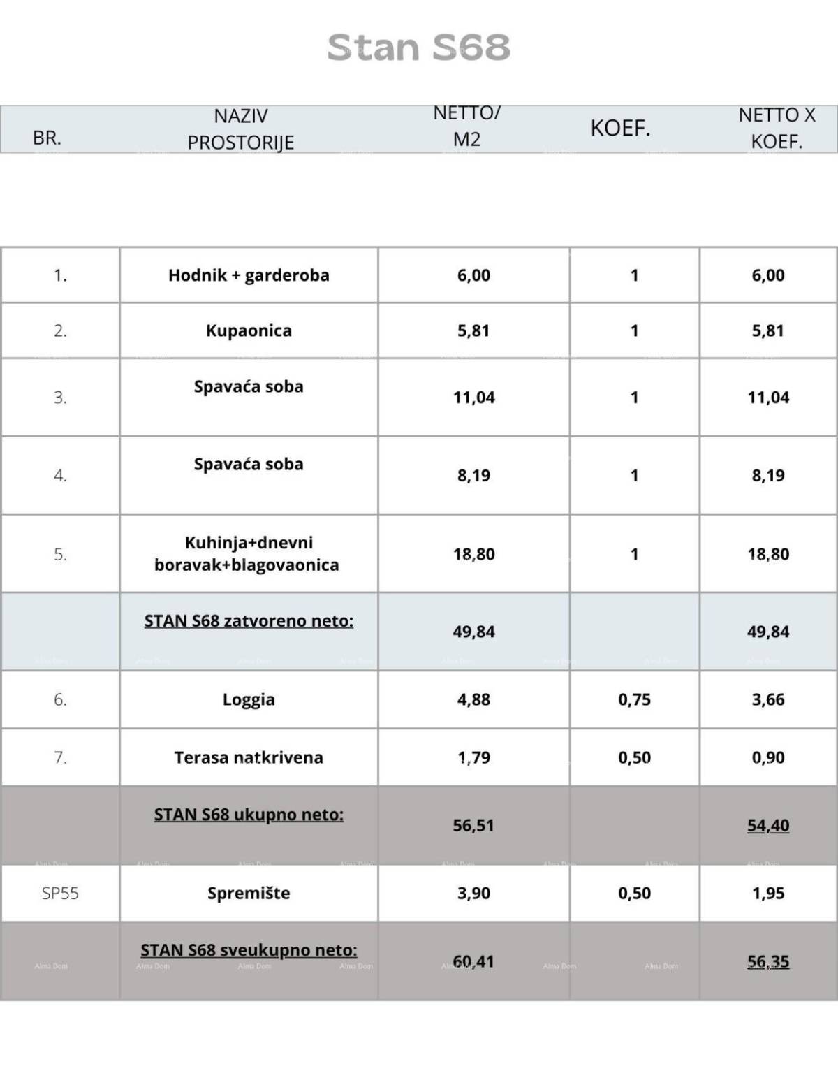 U ponudi je stan na 5. katu višestambene zgrade s liftom. Stan će se sastojati od ulaznog hodnika+garderoba, 2 spavaće sobe, kupaonice, kuhinje s blagavaonom te dnevnim boravkom, loggia-om i natkrivenom terasom.