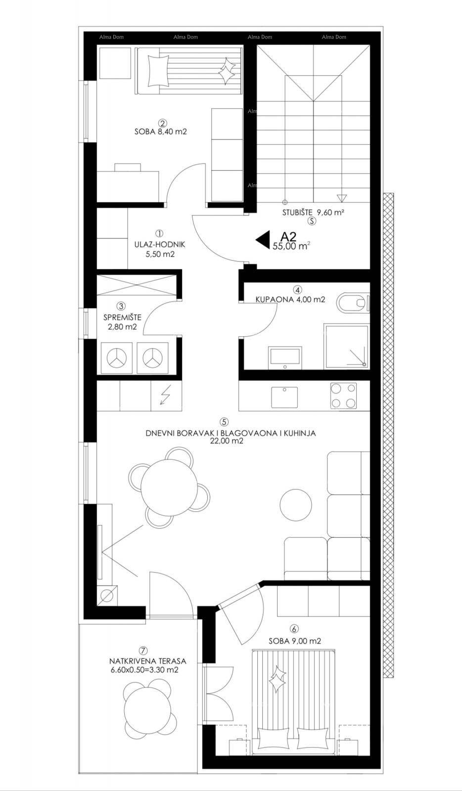 Stan A2 nalazi se na 1 katu zgrade i sastoji se od hodnika, kupaonice, 2 spavaće sobe, spremišta te kuhinje s blagovaonicom i dnevnim boravkom koji imaju izlaz na terasu.