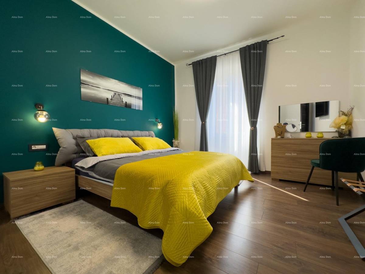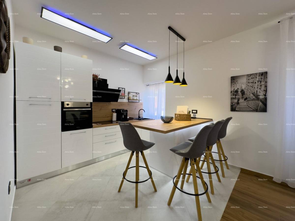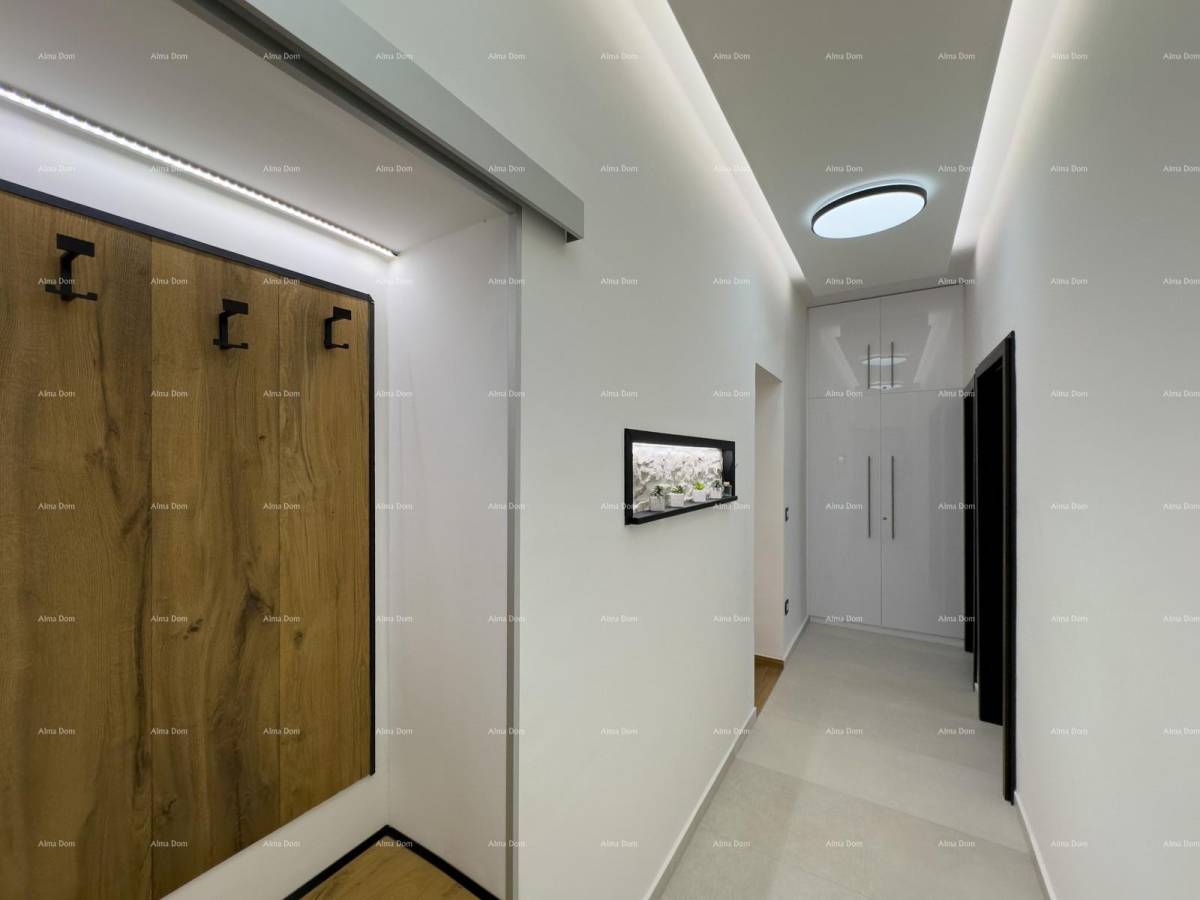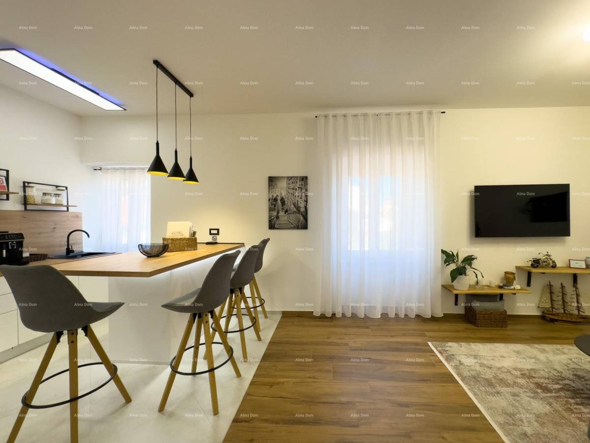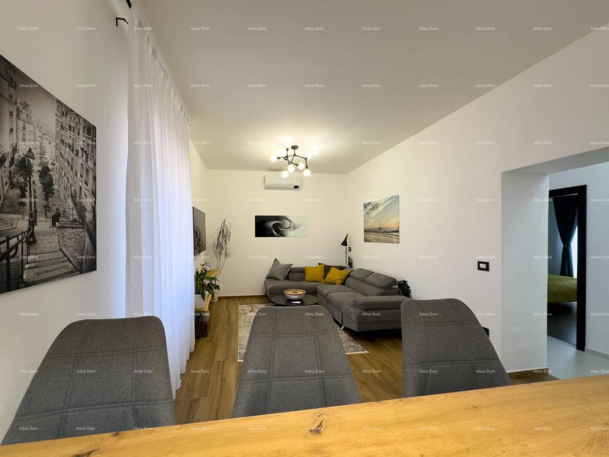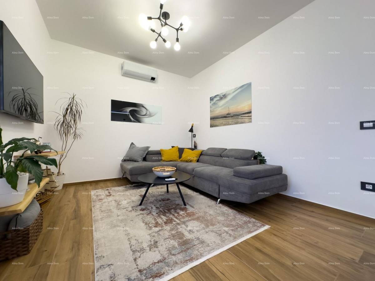 Raspored: dugački hodnik, kupatilo sa podnim grijanjem, blagovaonica, kuhinja, dnevni boravak , dvije spavaće sobe.
