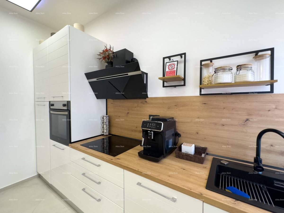 Raspored: dugački hodnik, kupatilo sa podnim grijanjem, blagovaonica, kuhinja, dnevni boravak , dvije spavaće sobe.