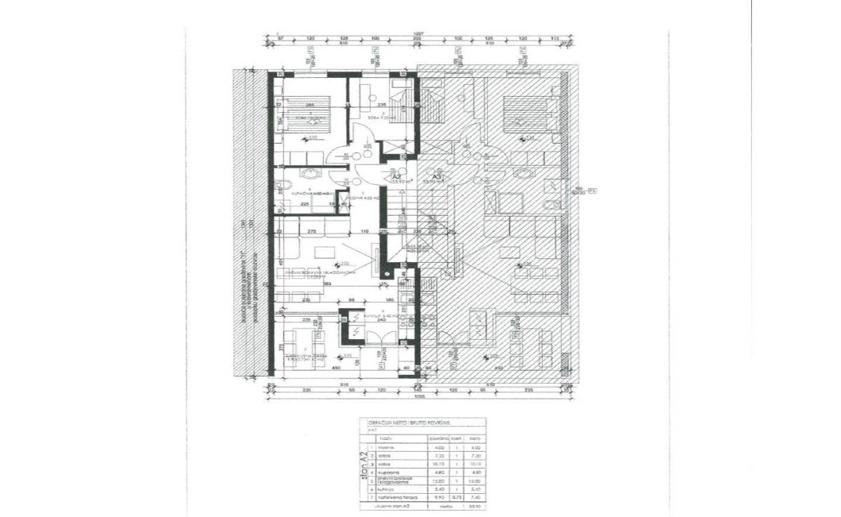 Stan se nalazi na prvom katu zgrade sa samo četiri stana. Sastoji se od dvije spavaće sobe, kupatila, ostave, kuhinje, blagovaonice i dnevnog boravka iz kog se izlazi na natkrivenu terasu.