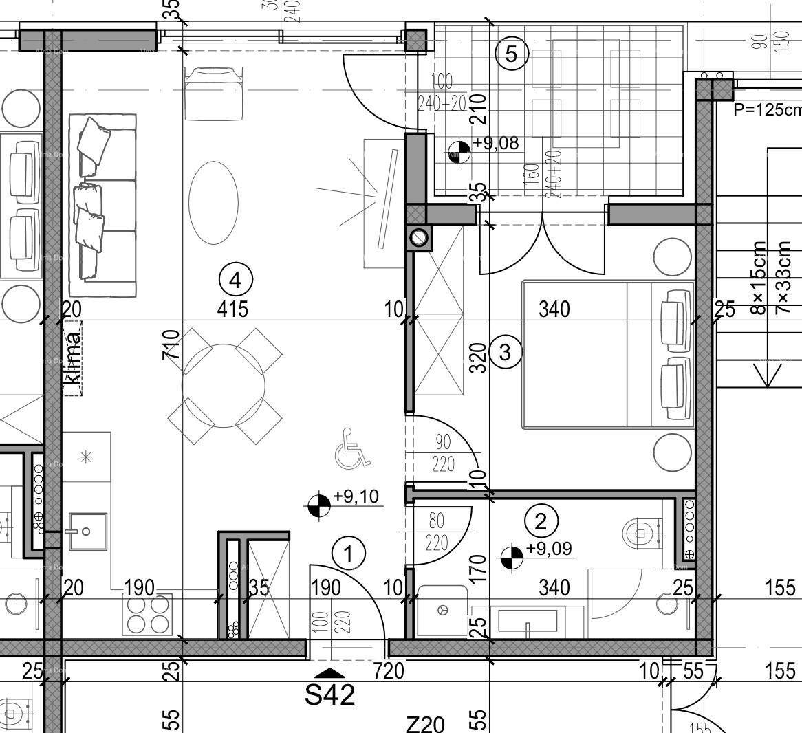 Stan se sastoji od ulaznog hodnika sa garderobom, spavaće sobe, kupaonice, kuhinje s blagavaonom, dnevnim boravkom i natkrivene terase.