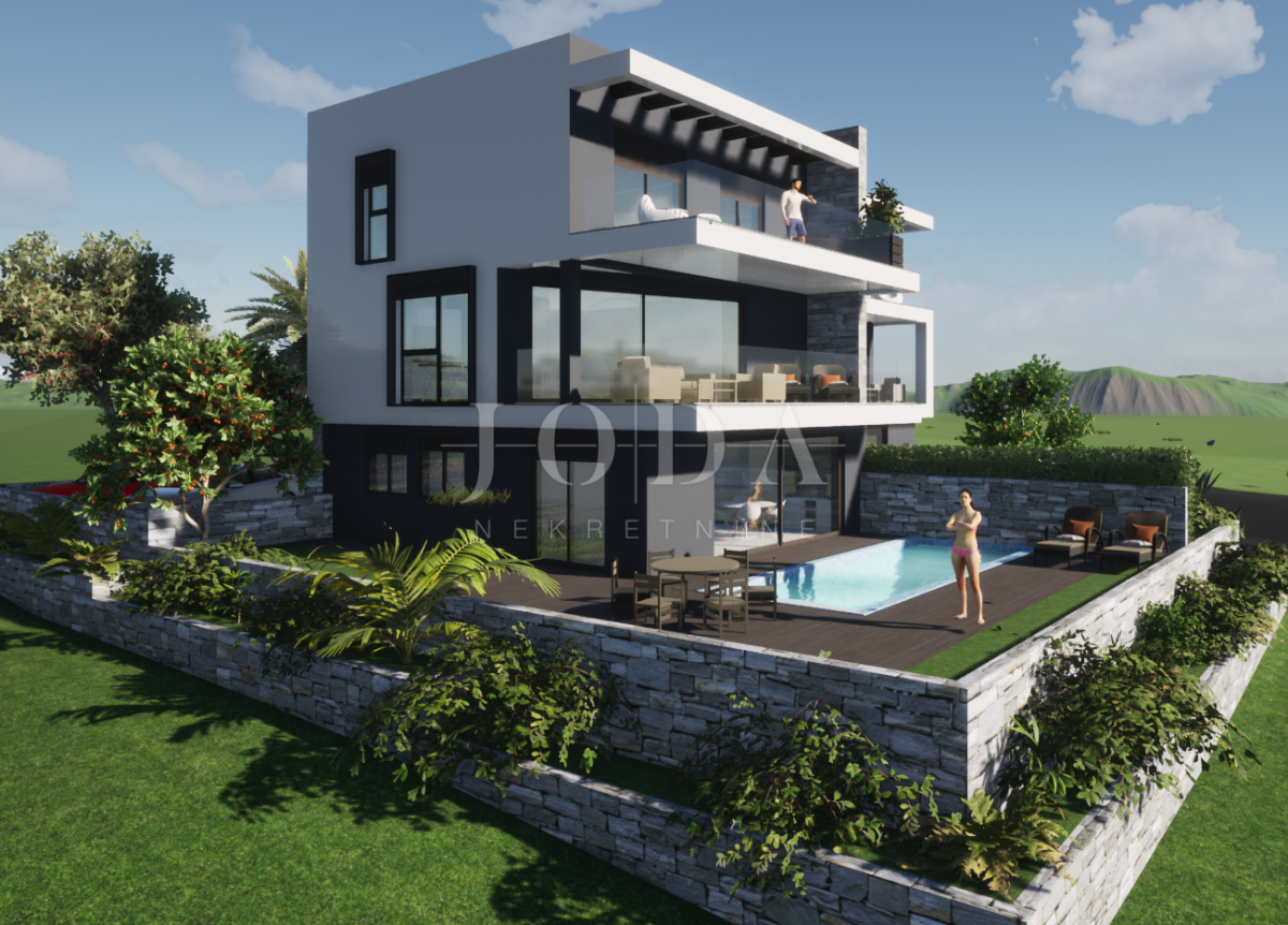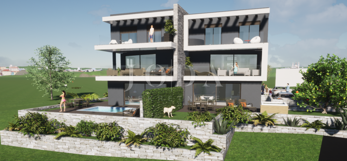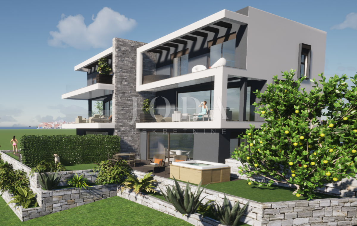 Apartman površine 116,83 m2 proteže se na prvi i drugi kat. Na prvom katu se nalaze dnevni boravak, kuhinja s blagovaonicom, WC, hodnik i natkrivena terasa površine 8,50 m2 Stubištem se dolazi do drugog kata gdje se nalaze tri spavaće sobe, dvije kupaonice, hodnik i balkon. Sustav grijanja i hlađenja pomoću dizalica topline, a ugrađeno je i podno grijanje.. Pri gradnji su korišteni i ugrađeni visoko kvalitetni materijali. Na raspolaganju su dva parkirna mjesta.