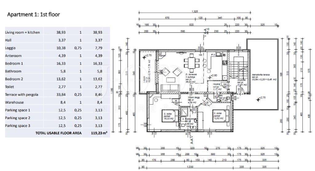 Apartman se nalazi na 1. katu i proteže se na 120 četvornih metara stambene površine. Ima dvije spavaće sobe, kuhinju s dnevnim boravkom, kupaonicu, zaseban WC, loggiu s pogledom na more, spremište i čak 2 parkirna mjesta.