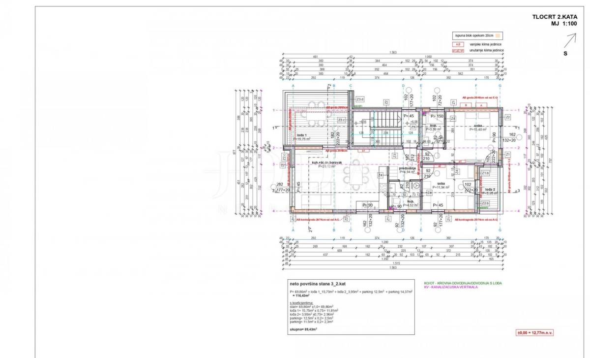 Stan se nalazi na drugom katu . Ima ukupno 90 četvornih metara prostora, uključujući dvije prostrane spavaće sobe i dvije moderno uređene kupaonice, kuhinju te prostrani dnevni boravak , .