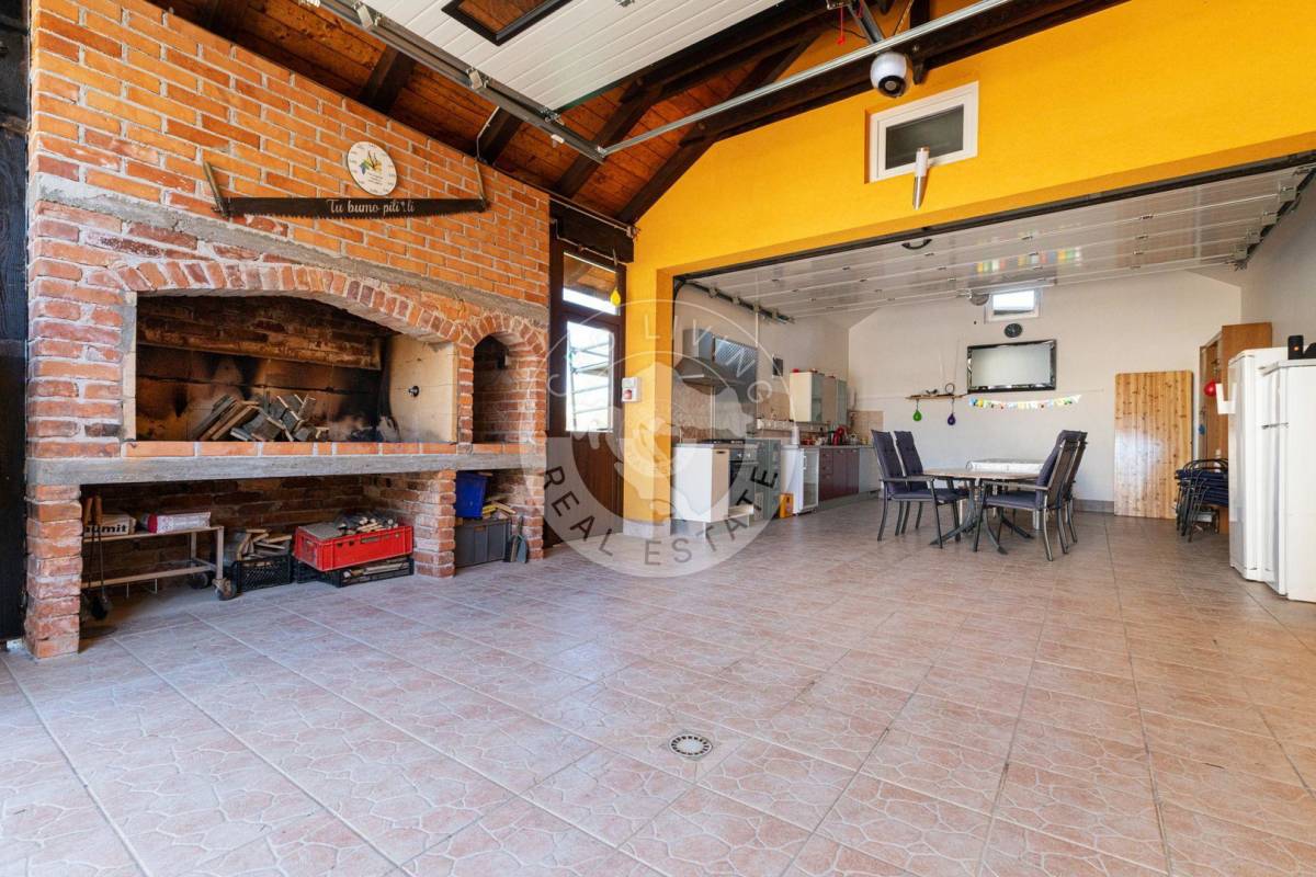 Od dva pomoćna objekta jedan je veličine 80 m2 i može biti u funkciji garaže ili prostora za obiteljska druženja – klimatiziran prostor sa duplom izolacijom zidova koji sadrži kuhinju i roštilj / ražanj, a drugi je 30ak m2 te je u funkciji radionice.