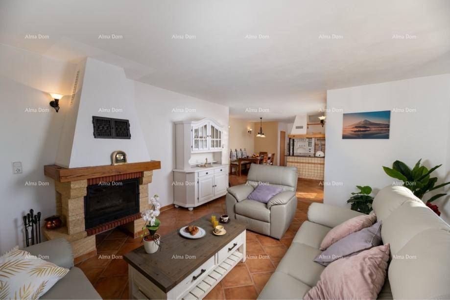 Vanjski prostor pažljivo je uređen – travnjak, bazen površine 34 m² s popločanom sunčališnom terasom, roštilj te dodatno spremište čine ovu nekretninu idealnom za uživanje i odmor. S parcele se pruža pogled prema moru koje se nazire u pozadini kroz zelenilo, što dodatno doprinosi posebnom ugođaju.