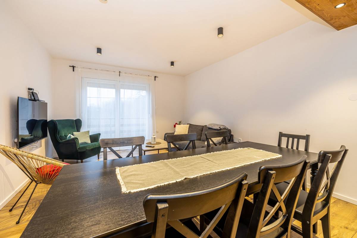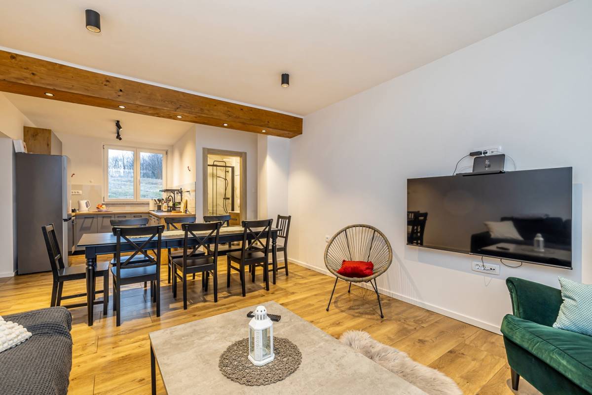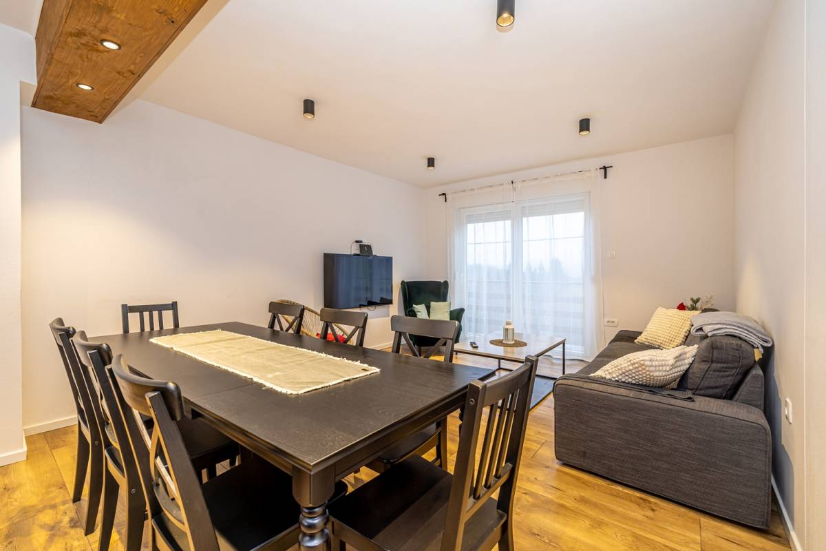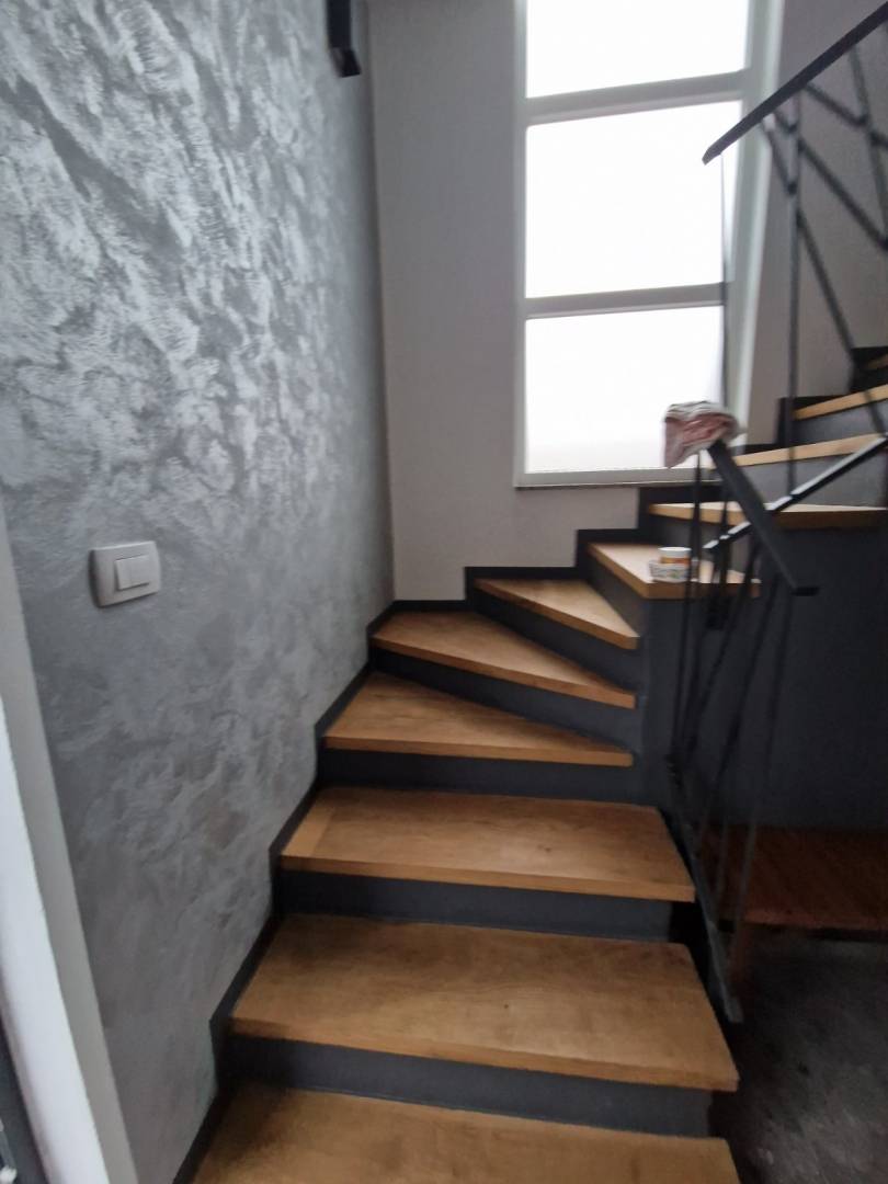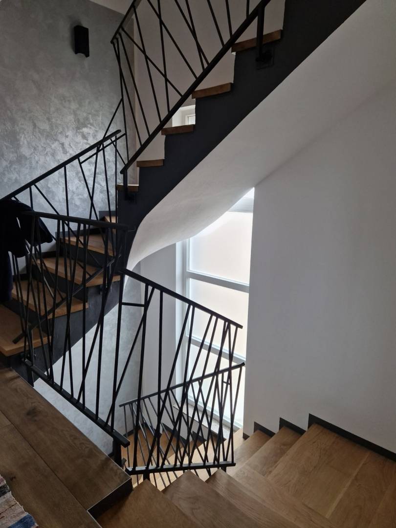 Na katu se nalaze kuhinja, blagovaonica sa dnevnim boravkom otvorenog tipa te spavaća soba i kupaonica. Dnevni boravak i spavaća soba imaju izlaz na zajedničku terasu.