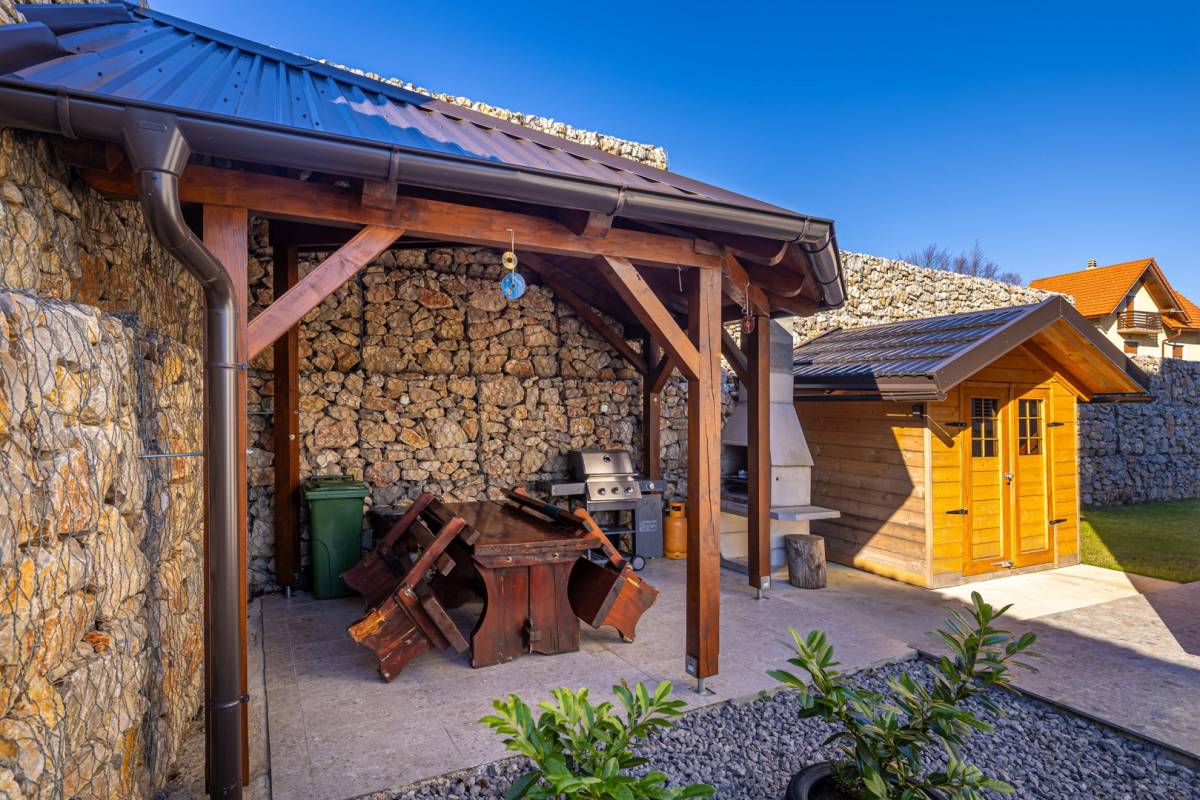 U dvorištu se nalaze natkrivena terasa, vrtna kućica, vanjski kamin te prostor za najmlađe. Velika okućnica pruža mogućnost više parkirnih mjesta ili uređenje po vlastitim željama.
