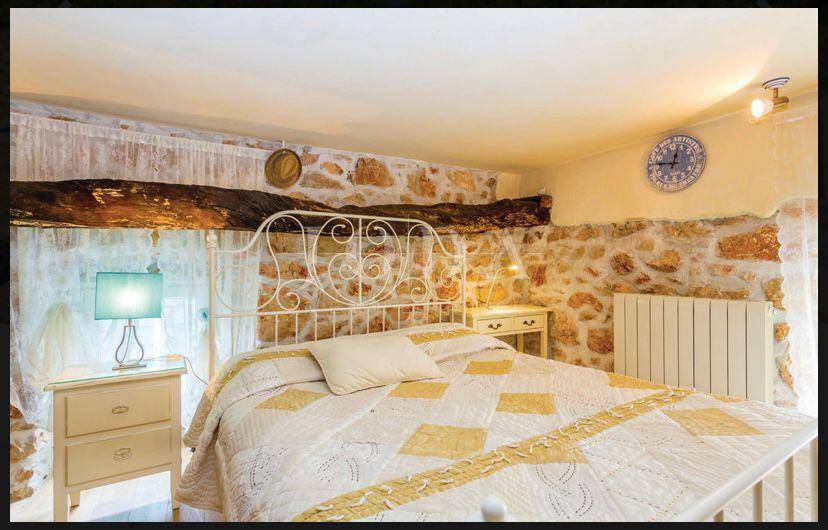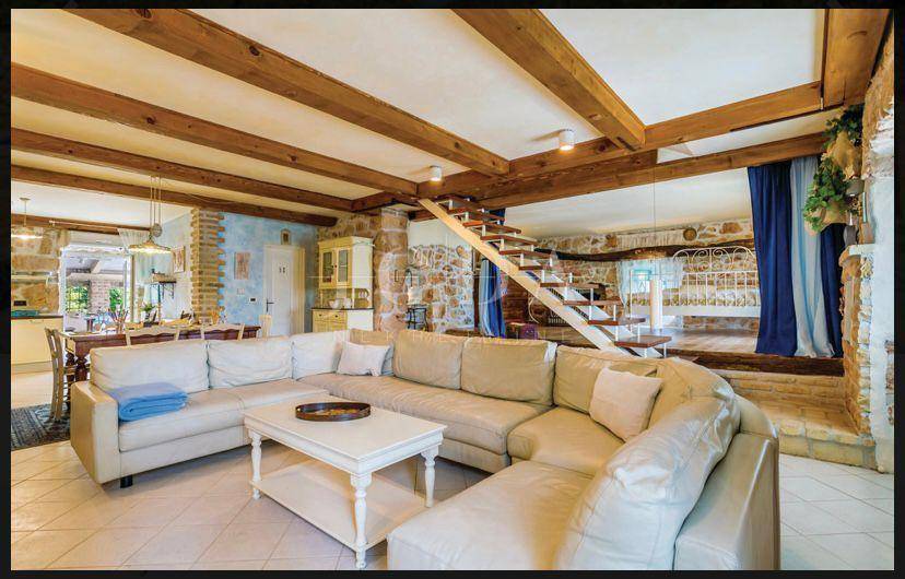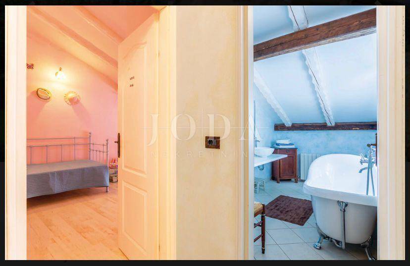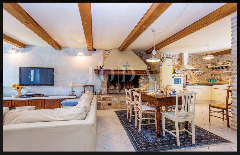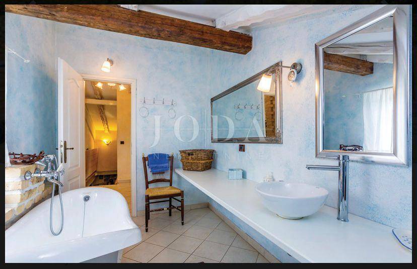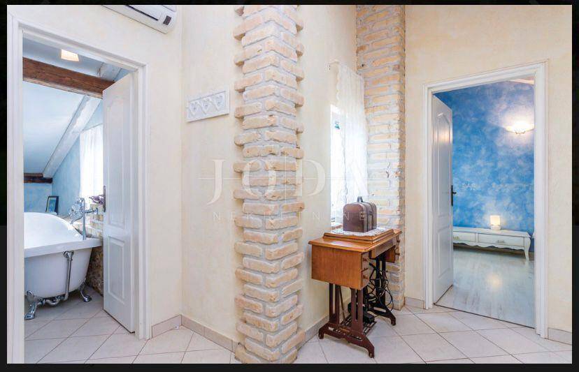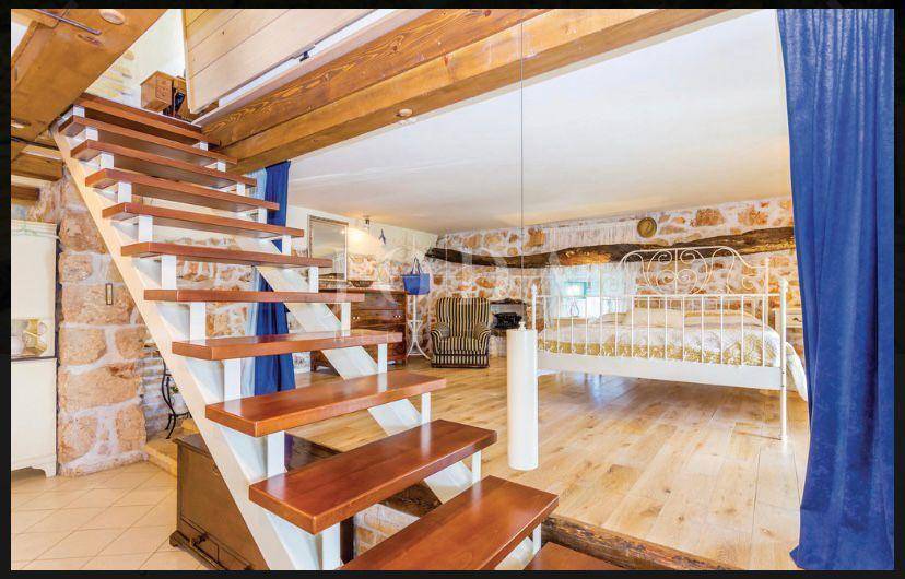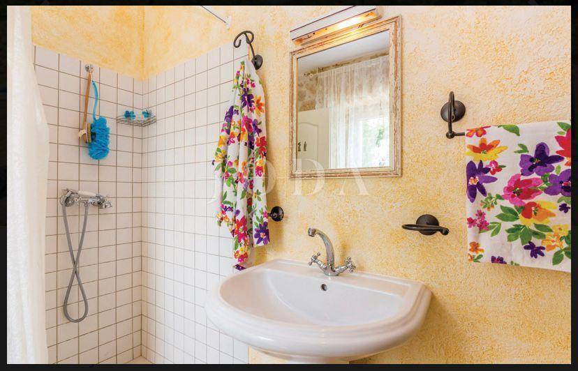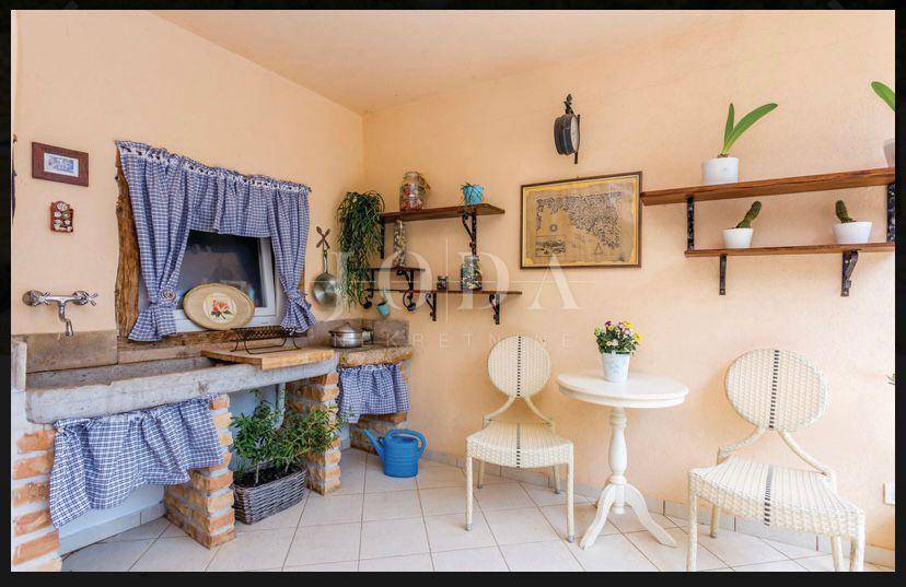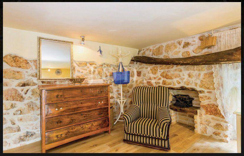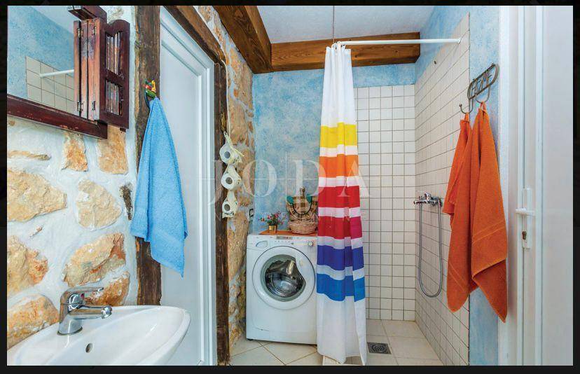 Kuća se sastoji od prizemlja s originalnim tošom za preradu maslinovog ulja, tehničke sobe s tehnikom za centralno grijanje i kupaonice. Vanjskim stepeništem dolazi se do stambenog dijela koji se sastoji od dnevnog boravka s kuhinjom i blagovaonicom, kupaonice te jedne prostorije koja se može urediti kao spavaća ili radna soba. Na ovoj etaži su još i dvije terase s kojih se pruža pogled na bazen sa sunčalištem i pristupa okućnici. U visokom potkrovlju nalaze se tri spavaće sobe te jedna kupaonica.