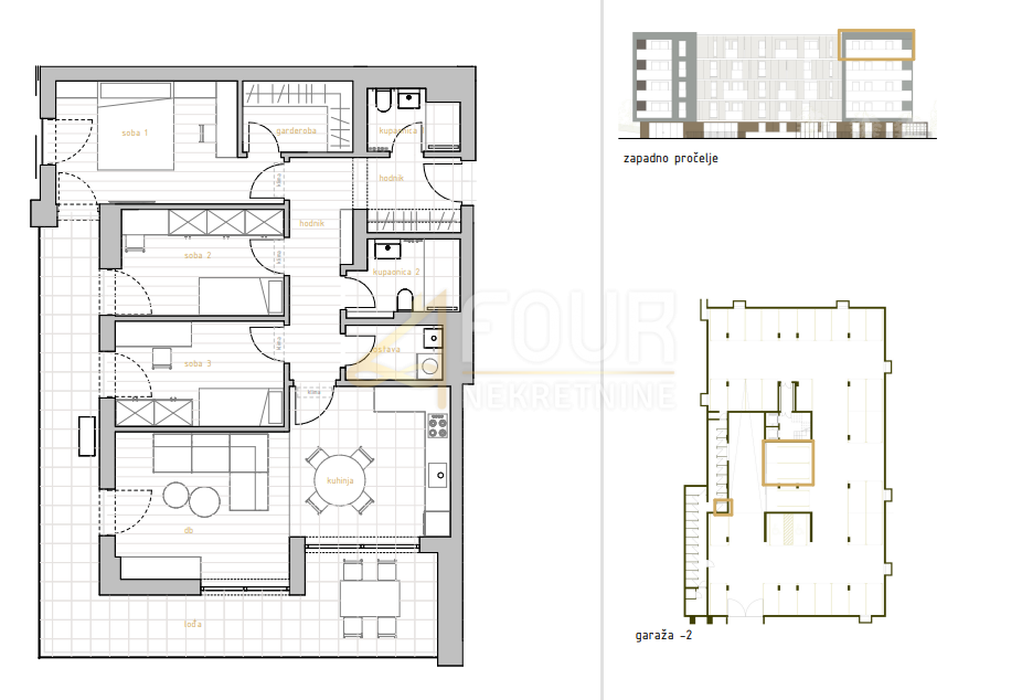 Uz stan dolazi spremište u podrumu te dva garažna parkirna mjesta.