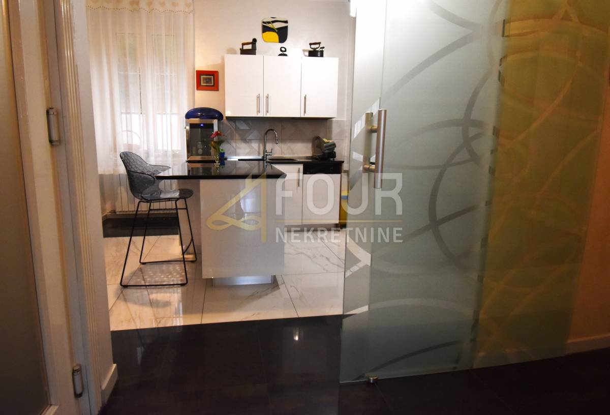 Podovi u sobama su izvrsni hrastovi parketi, dok su ostali podovi obloženi kvalitetnom talijanskom keramikom. Kuhinja je rađena po mjeri s radnom pločom od granita. Tri sobe nude dovoljno prostora za spavanje, rad ili odlaganje, dok prostrana kupaonica, zaseban toalet i praonica dodatno podižu funkcionalnost stana.