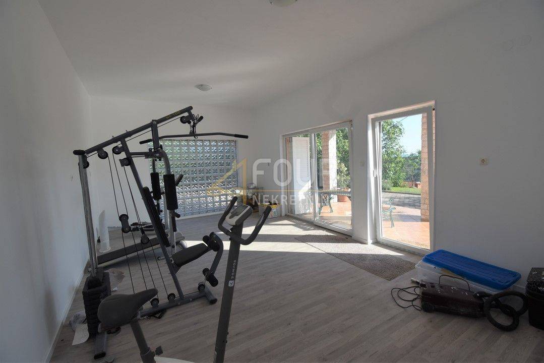 U prizemlju kuće se nalazi i garaža. Na vrlo lijepoj i kultiviranoj okućnici osim cvijeća i mediteranskog bilja nalazi se i bazen, tuš te prostrana natkrivena ljetna kuhinja.