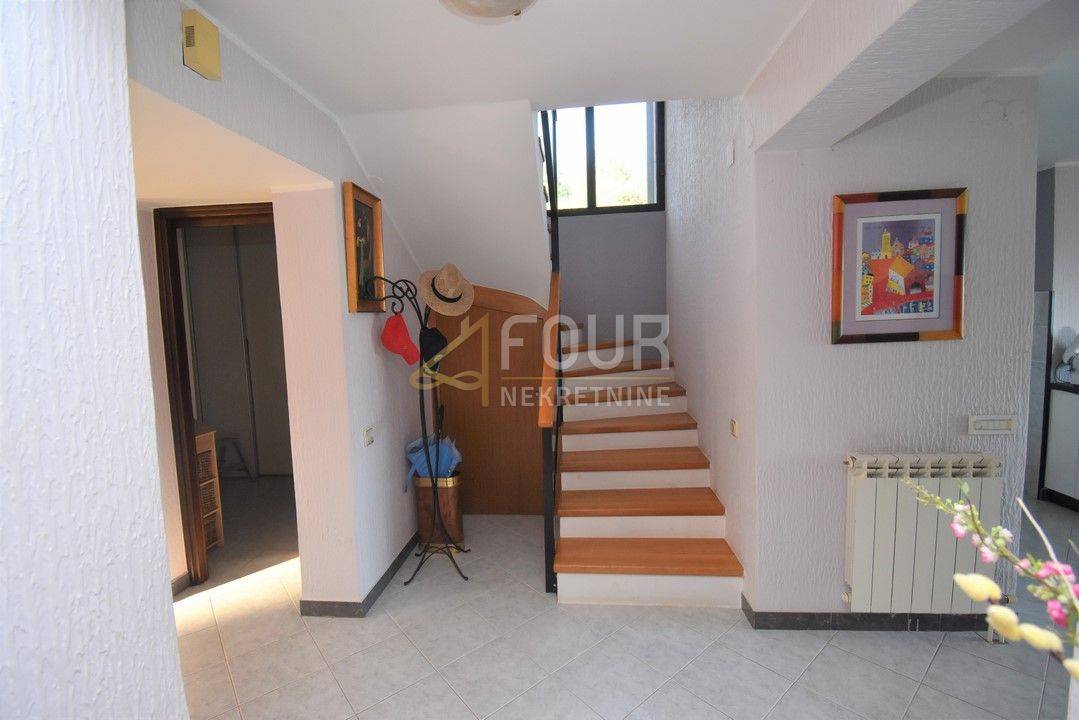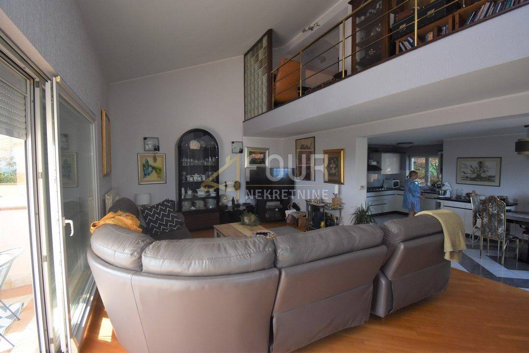Sama kuća sastoji se od dva stana. U prizemlju je stan površine 70 m2 koji nije namješten. Na katu se nalazi prostran dvoetažni stan. U donjem djelu nalazi se kuhinja i blagovaonica te prostrani dnevni boravak sa izlazom na terasu sa koje se pruža pogled na more, jedne spavaće sobe, radne sobe te kupaonice i toaleta. Na gornjoj etaži se nalazi walk-in ormar, kupaonica, jedna spavaća soba sa balkonom te galerija kao prostor za čitanje ili radni dio.
