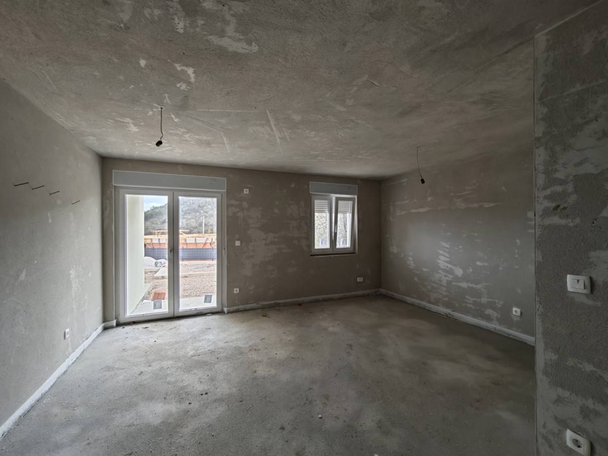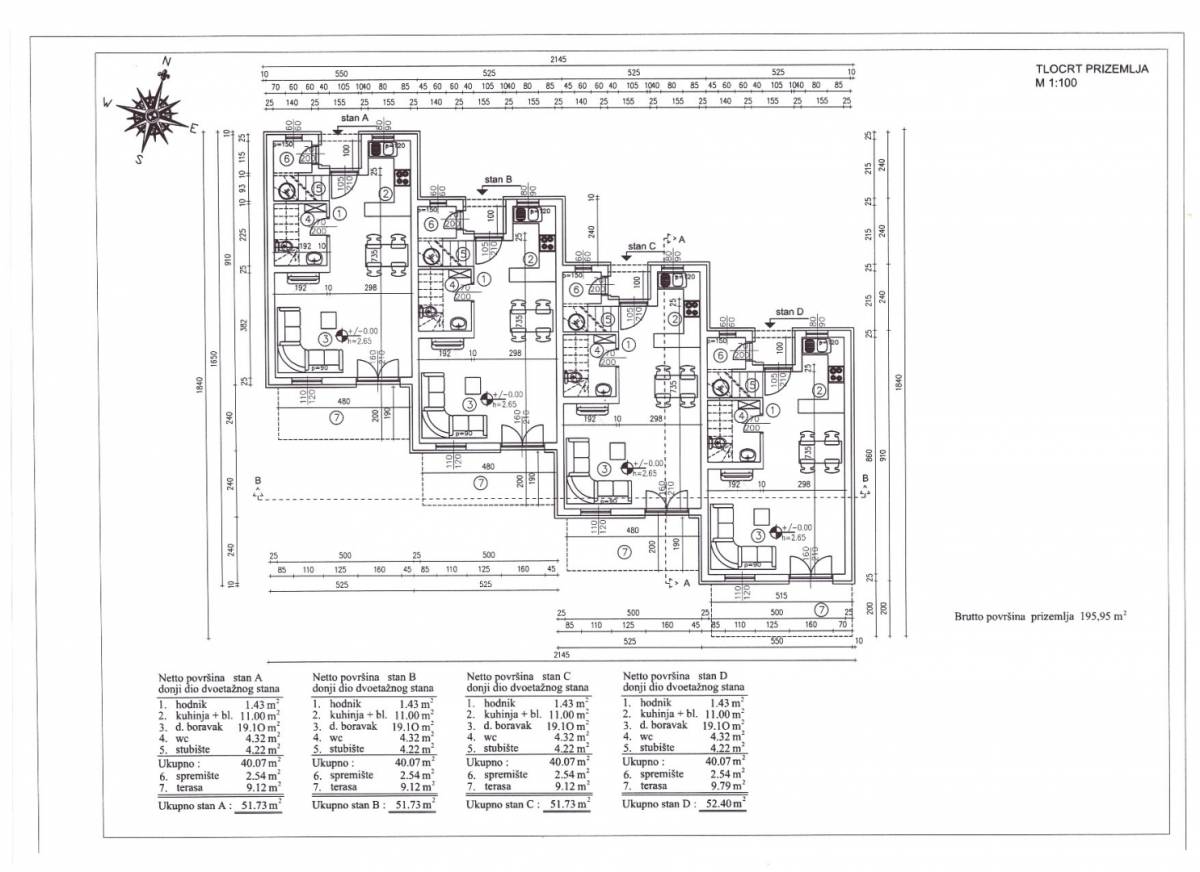 Svaka jedinica ima oko 90 m2 i organizirana je kroz dvije etaže. Prizemlje čini dnevni prostor povezan s kuhinjom i blagovaonicom, uz gostinjski WC i izlaz na terasu. Taj dio se koristi kroz veći dio dana. Izlaz na okućnicu omogućuje boravak vani bez odlaska iz kuće. U prizemlju se nalazi i vanjsko spremište od 2,54 m2.