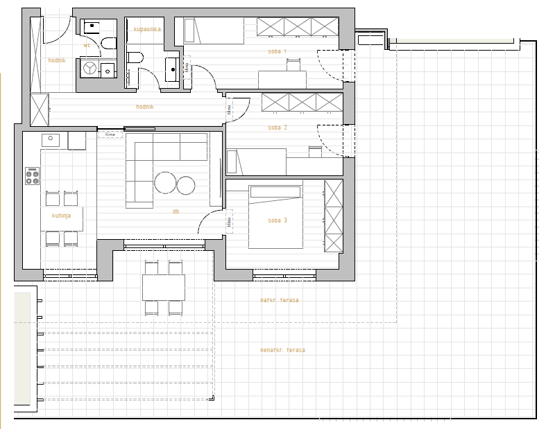 Stan 2.1 nalazi se na prvom katu moderno projektirane zgrade i nudi iznimno praktičan raspored prilagođen svakodnevnom obiteljskom životu. Ulazni hodnik dijeli stan na dnevni i spavaći dio, stvarajući jasno definirane zone privatnosti i zajedničkog boravka.