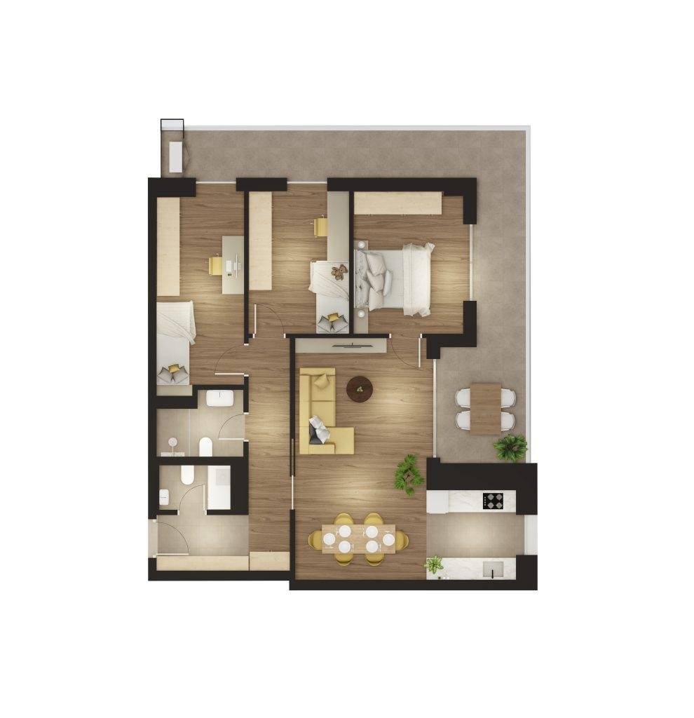Tri spavaće sobe nude dovoljno prostora za članove obitelji, a dodatni wc olakšava dnevnu rutinu u višečlanom kućanstvu. Kupaonica je funkcionalno uređena, dok otvoreni dnevni prostor s kuhinjom i blagovaonicom čini srce stana. Iz dnevnog boravka izlazi se na prostranu lođu, koja nudi dodatni kutak za boravak na otvorenom tijekom toplijih mjeseci. Dva garažna mjesta i spremište u podrumu dodatno podižu vrijednost stana.