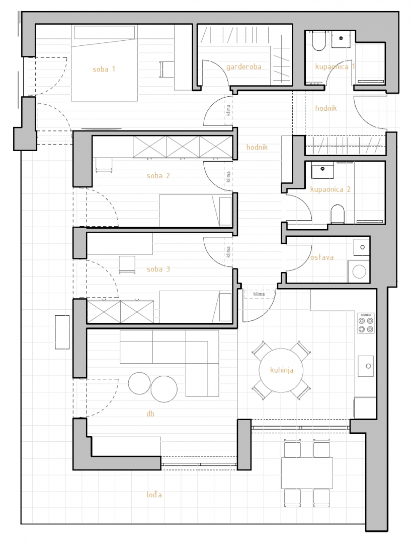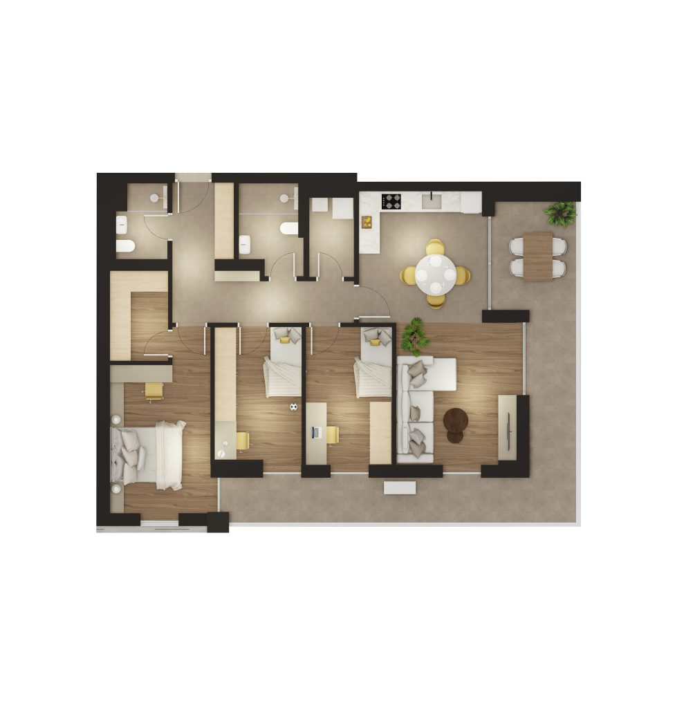 Stan 1.3 smješten je na trećem katu zgrade, a svojim funkcionalnim rasporedom i prostranom lođom pruža iznimno ugodan ambijent za svakodnevni obiteljski život. Hodnik vodi prema spavaćem dijelu stana gdje se nalaze tri spavaće sobe, a dodatna garderoba i ostava olakšavaju organizaciju prostora. Dvije kupaonice omogućuju komfor većem kućanstvu.