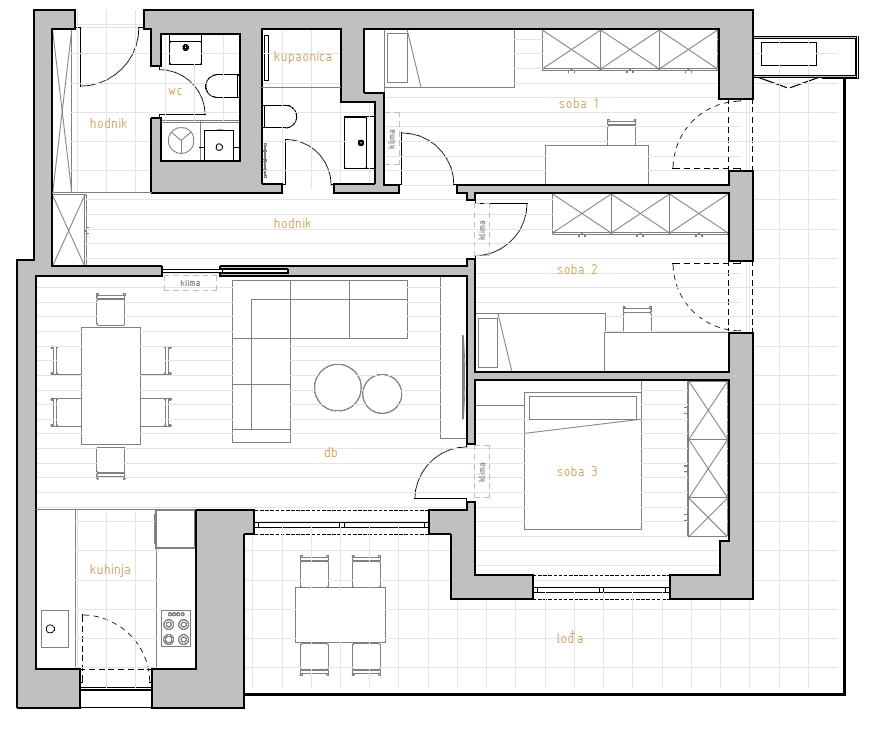 U privatnom dijelu stana nalaze se tri spavaće sobe. Glavna kupaonica i dodatni wc pružaju veću praktičnost i komfor, osobito za obitelji. Prisutnost garderobe i funkcionalna ostava omogućuju bolju organizaciju svakodnevice i dodatni prostor za odlaganje.