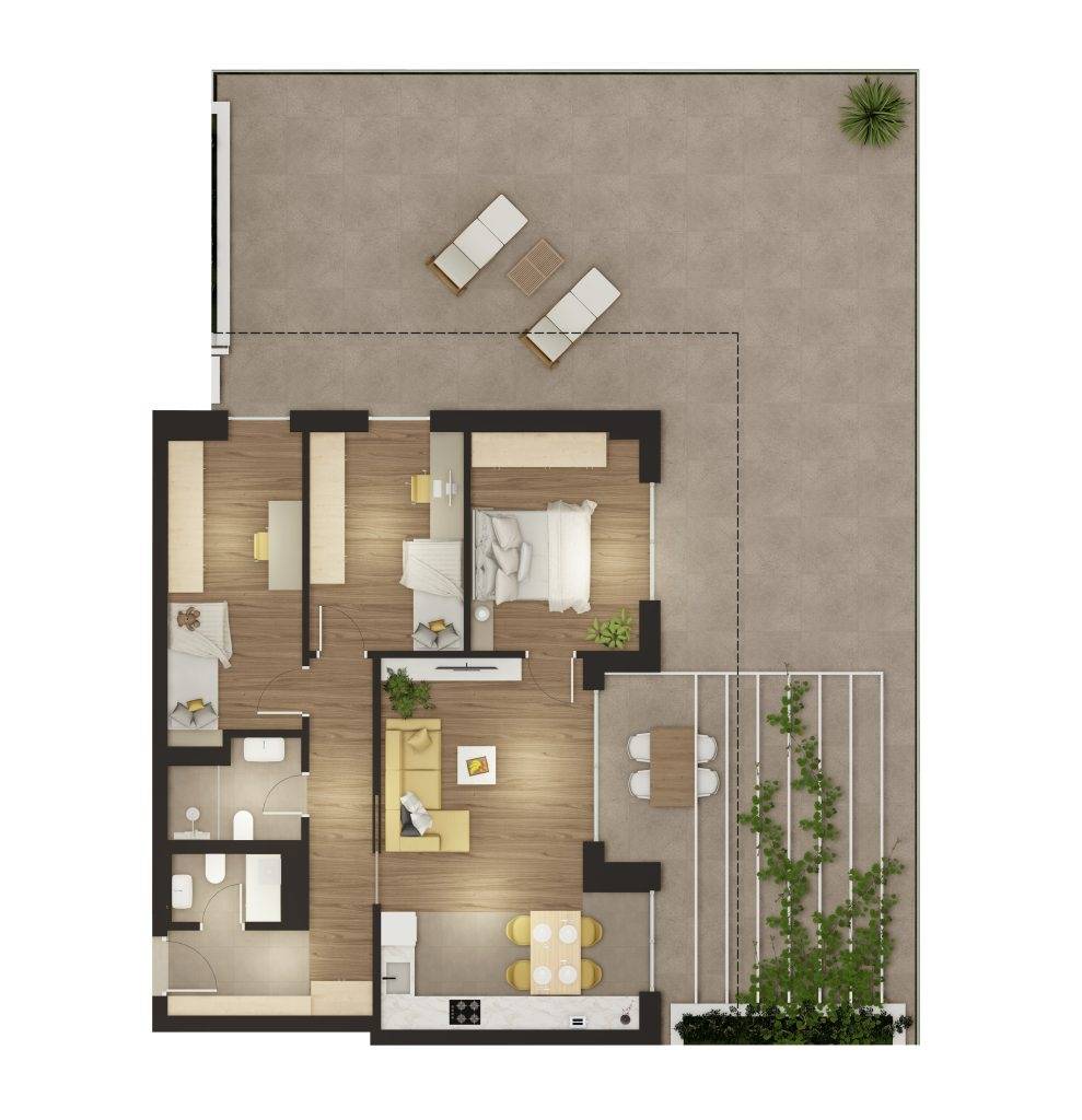 Stan 2.0 smješten je u prizemlju moderne zgrade i ističe se iznimno velikim vanjskim prostorom koji uključuje dvije terase i privatnost kakvu rijetko nude stanovi u urbanoj sredini. Raspored stana osmišljen je za udoban obiteljski život, s jasno odvojenim dnevnim i noćnim dijelom.