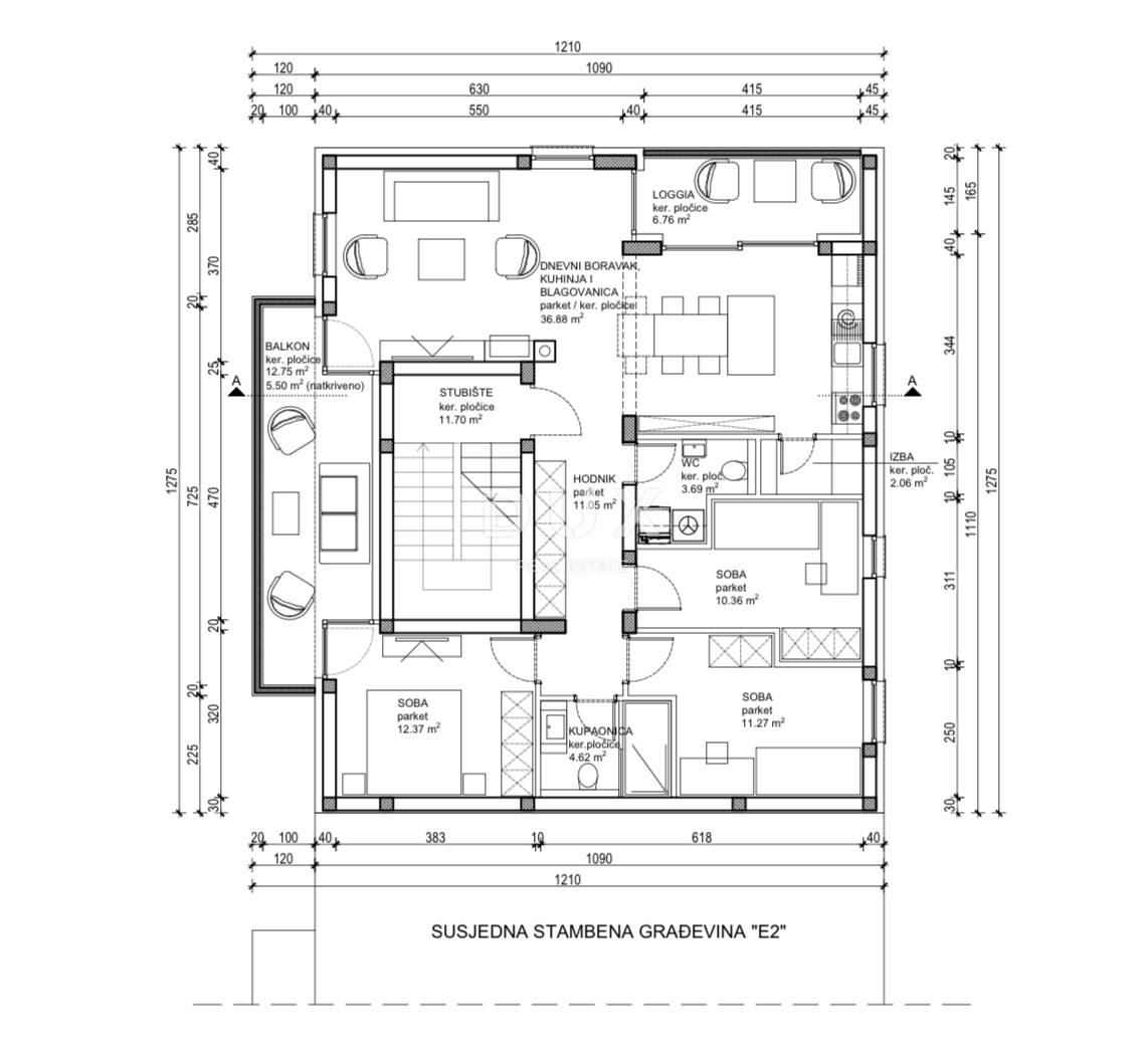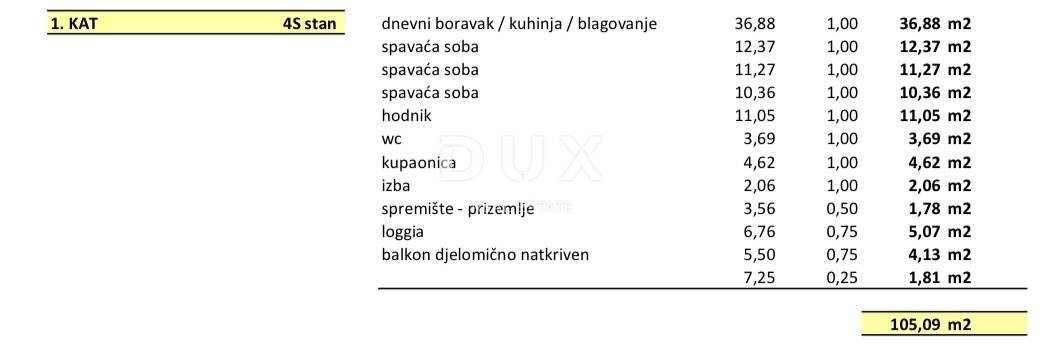 Ukupno: 115,37 m² (s koef. = 105,09 m²)