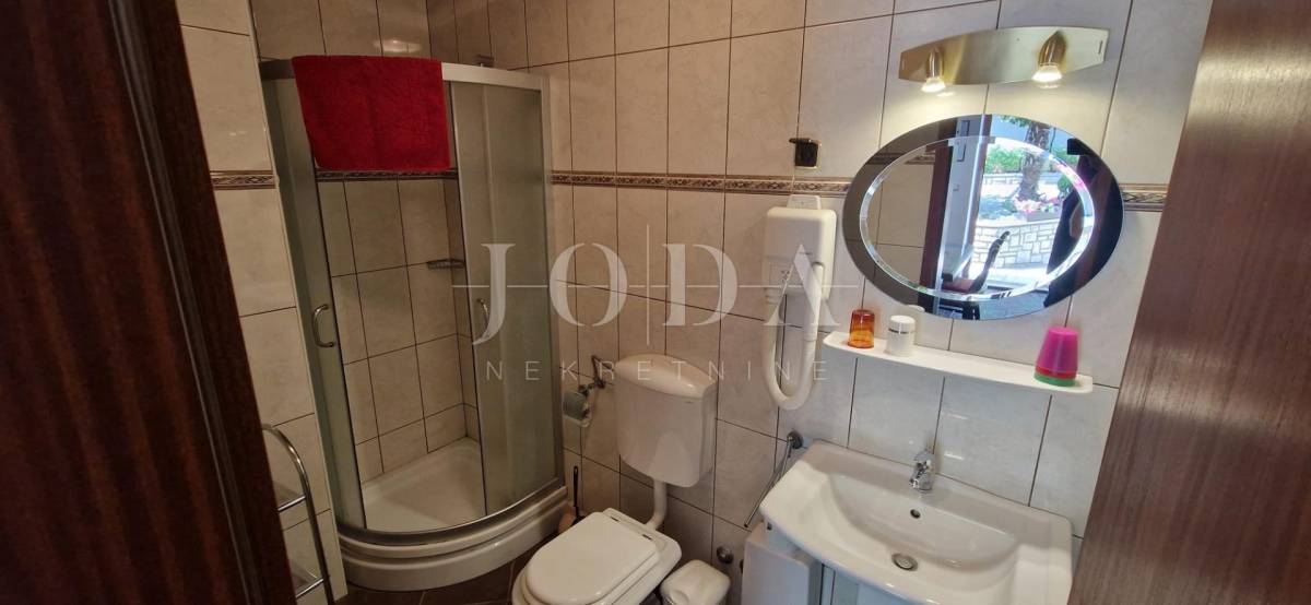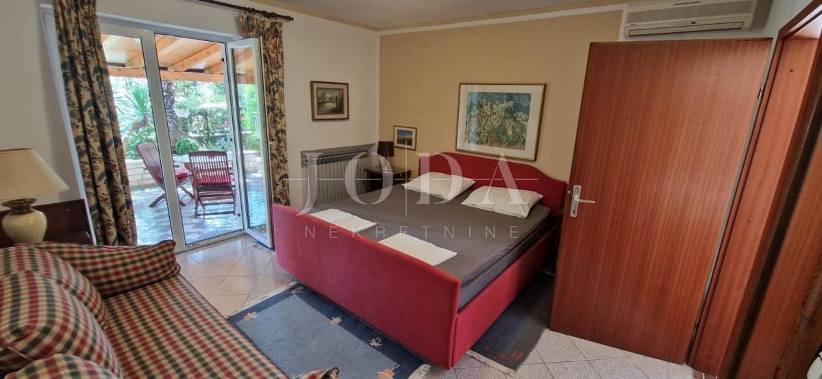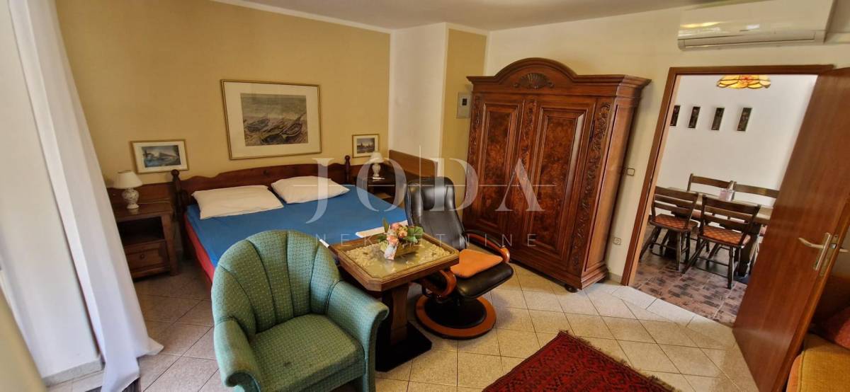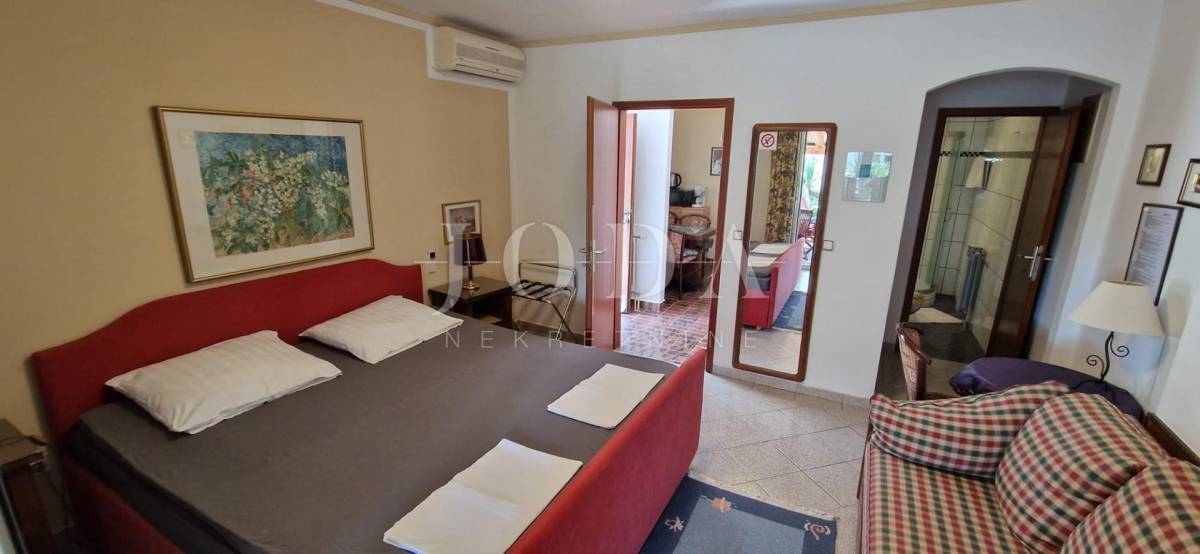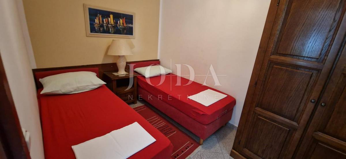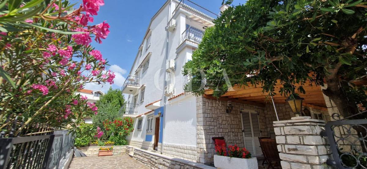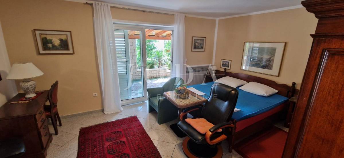 Prodajemo prekrasnu apartmansku villu na 4 etaže, udaljenu 300 m od mora. U prizemlju su 2 apartmana sa velikim terasama, kuhinja koja je dugi niz godina služila za spremanje doručka za goste, blagovaona i terasa koja može ugostiti 20 ljudi, zatim ostava sa praonicom rublja te kotlovnica sa sustavom grijanja i spremnikom za toplu vodu.