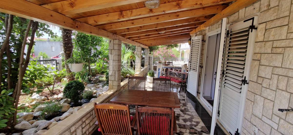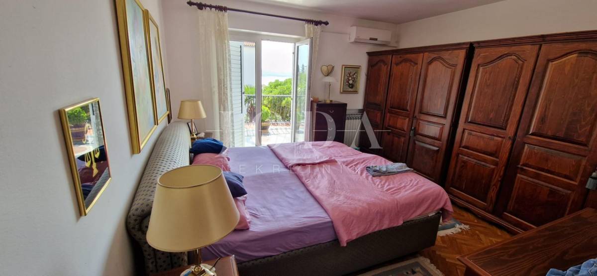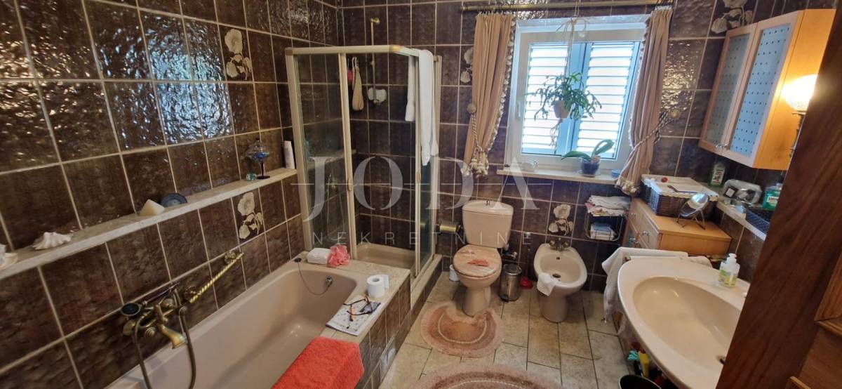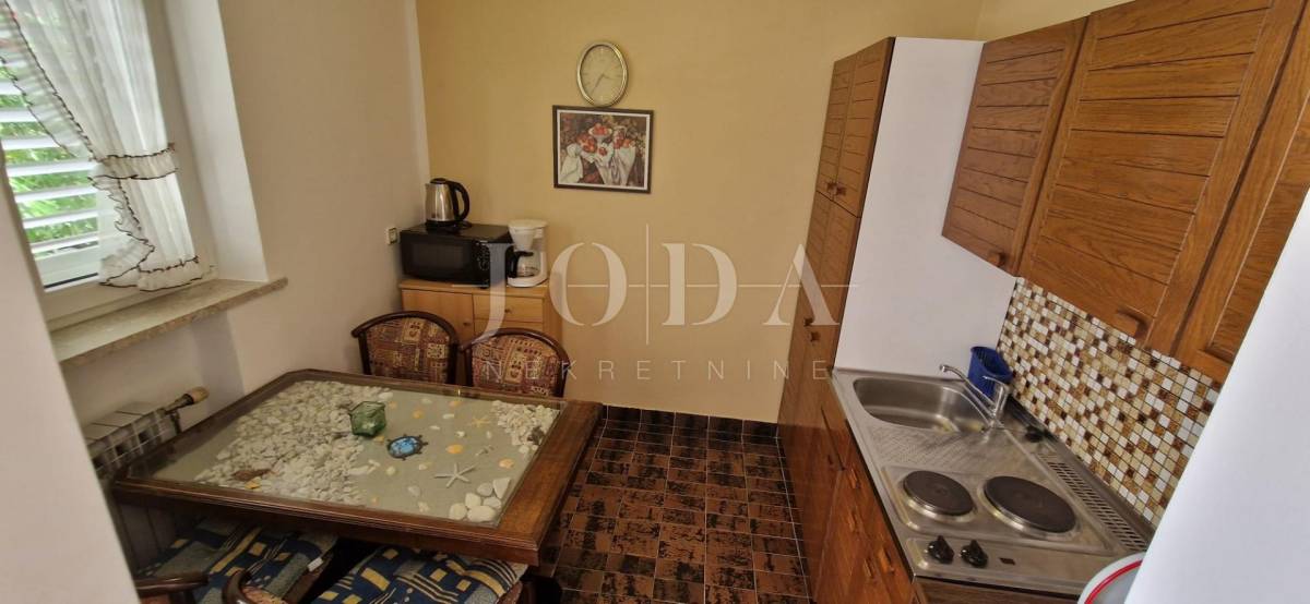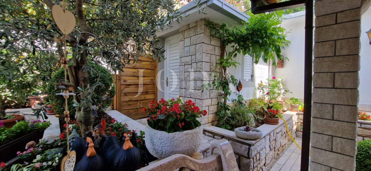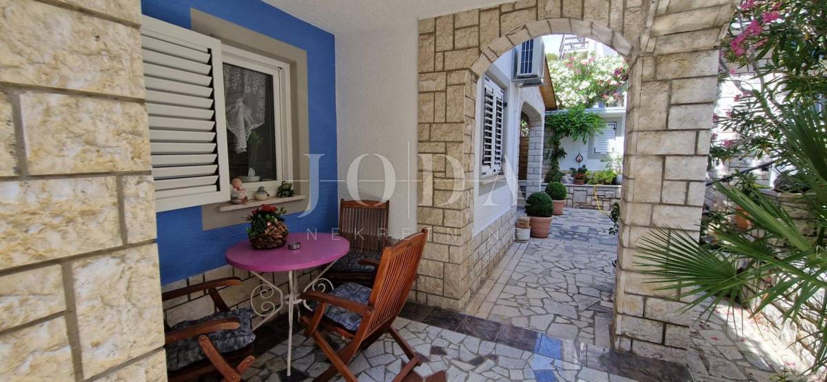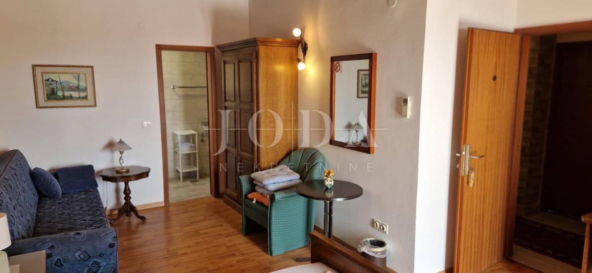 Prodajemo prekrasnu apartmansku villu na 4 etaže, udaljenu 300 m od mora. U prizemlju su 2 apartmana sa velikim terasama, kuhinja koja je dugi niz godina služila za spremanje doručka za goste, blagovaona i terasa koja može ugostiti 20 ljudi, zatim ostava sa praonicom rublja te kotlovnica sa sustavom grijanja i spremnikom za toplu vodu.