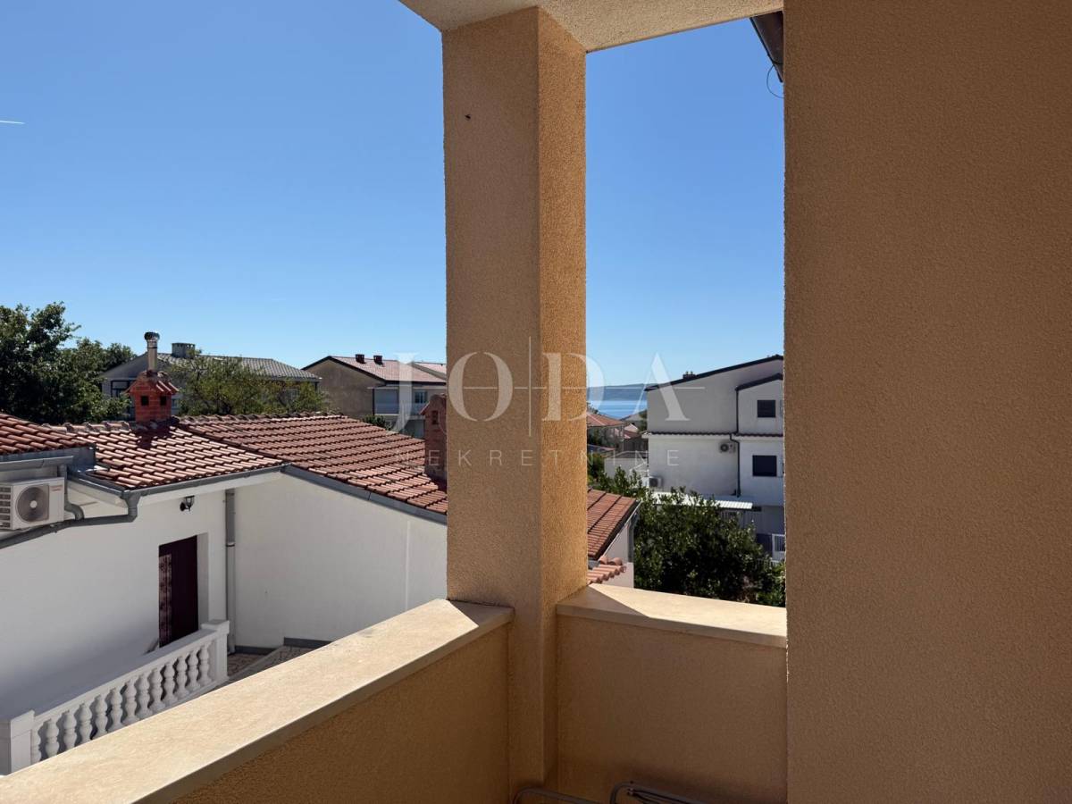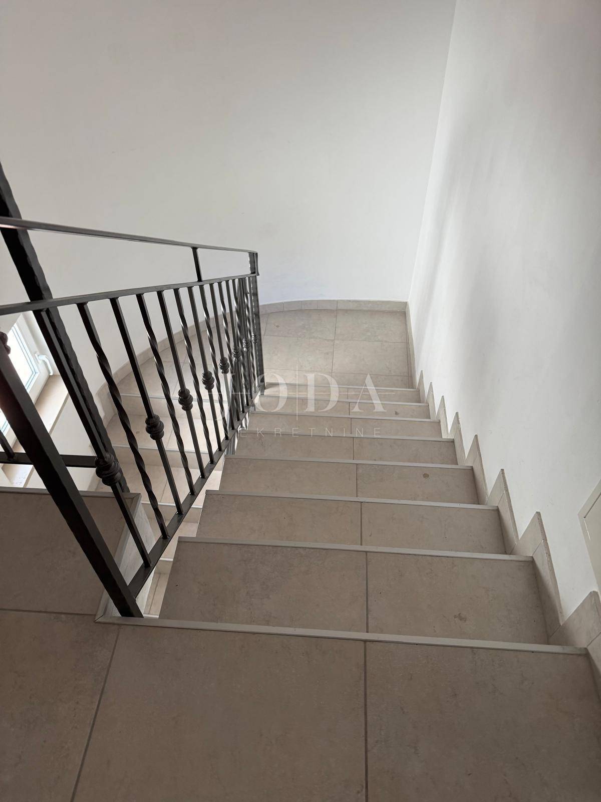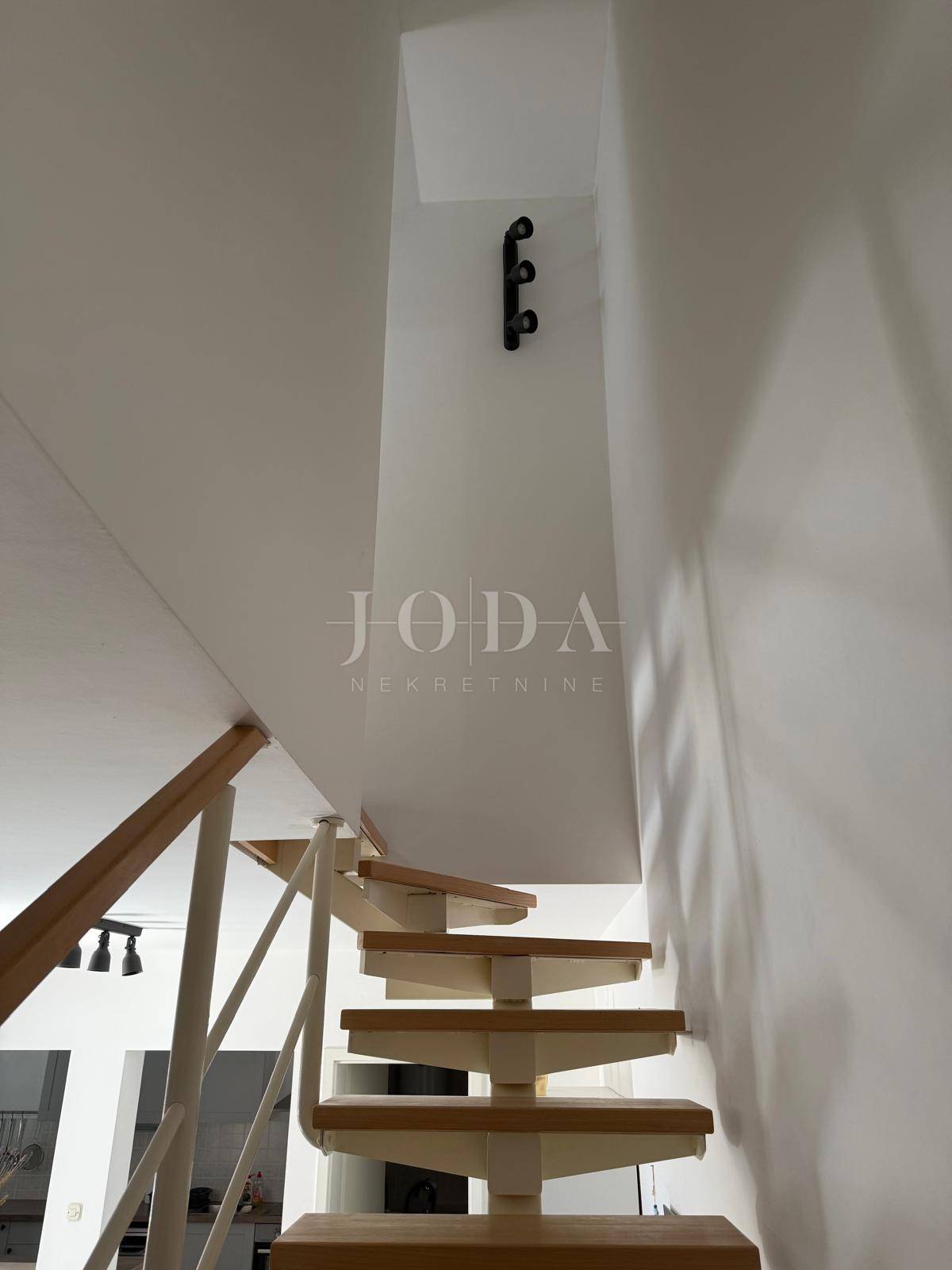 Stan u novijoj zgradi na 2. katu, dvoetažni stan. Sastoji se od kuhinje, blagovaone i dnevnog boravka, balkona i kupatila i wc-a. Unutrašnje stepenice vode na kat, gdje su dvije spavaće sobe i kupatilo i wc. Stan se prodaje kompletno namješten. Blizina centra i mora 300 m.