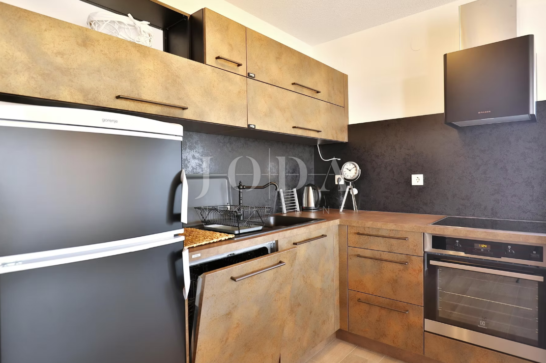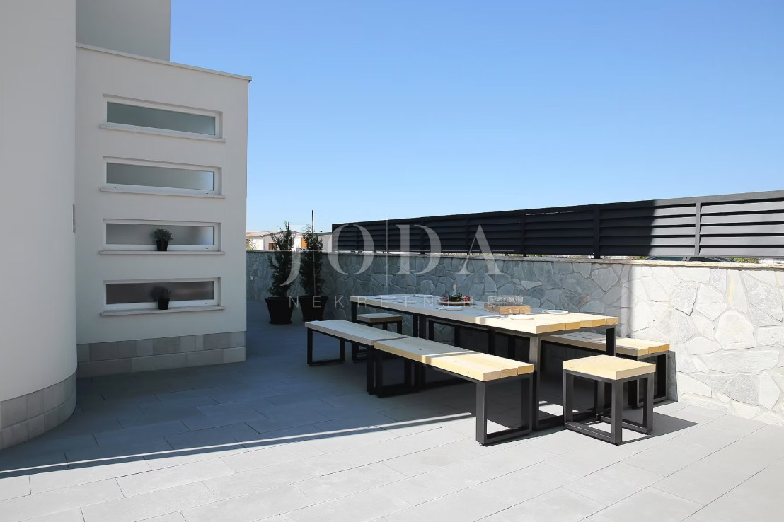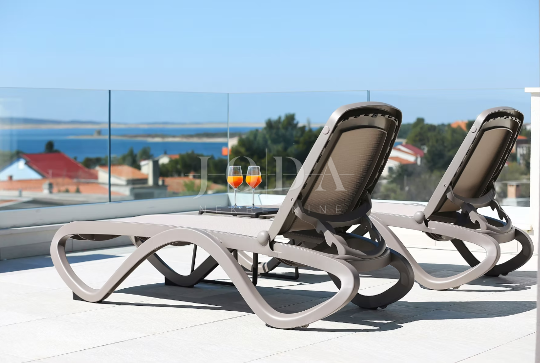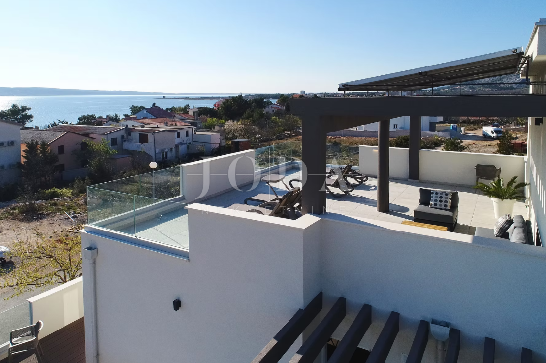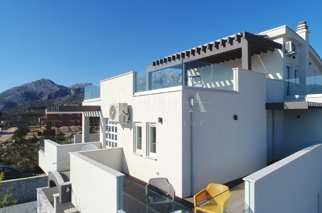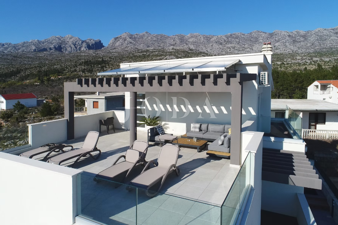Vila se prostire na prostranom zemljištu s uređenim vrtom, privatnim grijanim bazenom dimenzija 7x3.5m i velikim terasama s kojih se pruža spektakularan pogled na more i Velebit. U unutrašnjosti se nalazi kombinacija prostranih apartmana i zajedničkih prostora za druženje, s modernim kuhinjama, klimatiziranim sobama i centralnim grijanjem koje osigurava udobnost tijekom cijele godine.