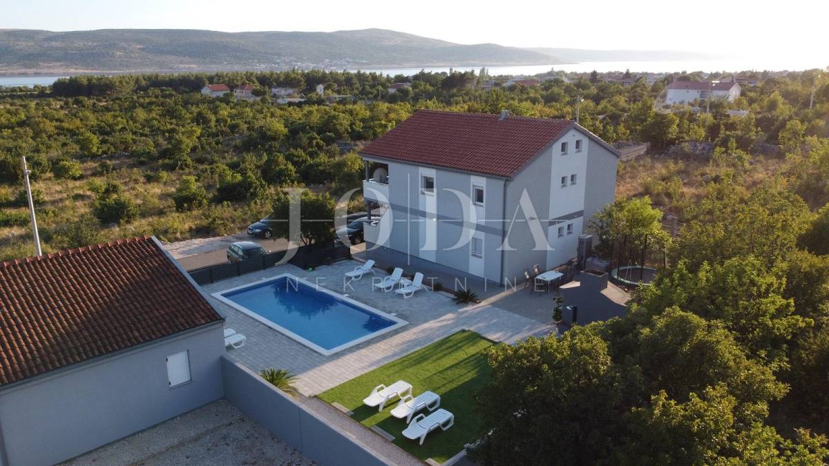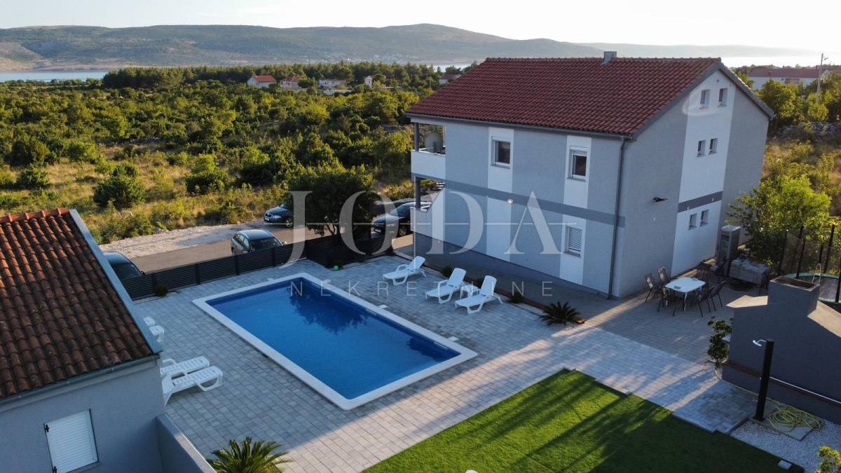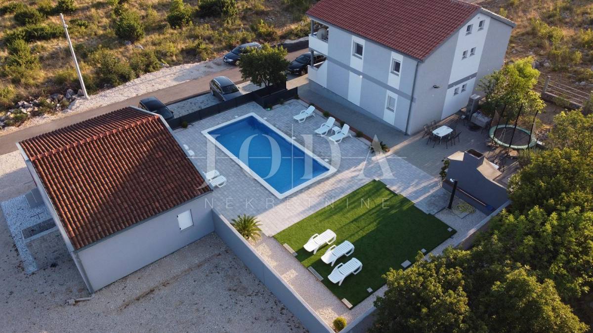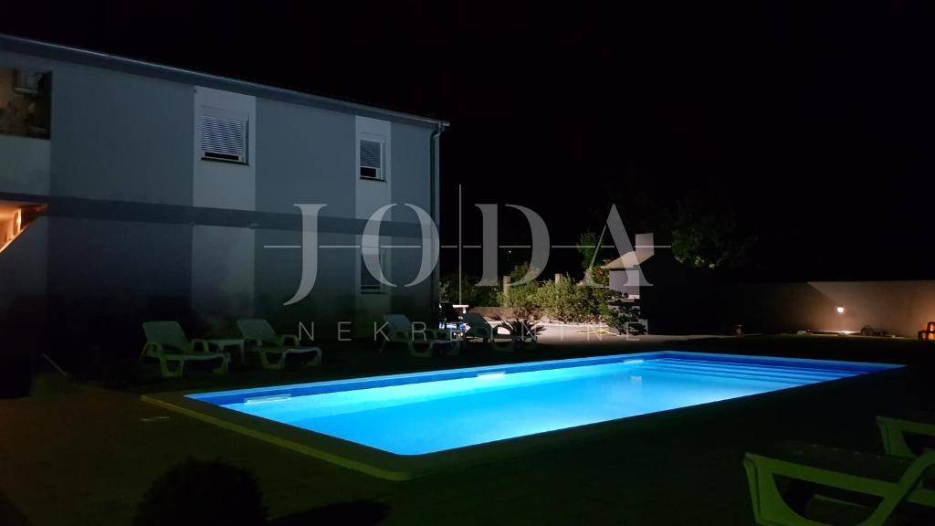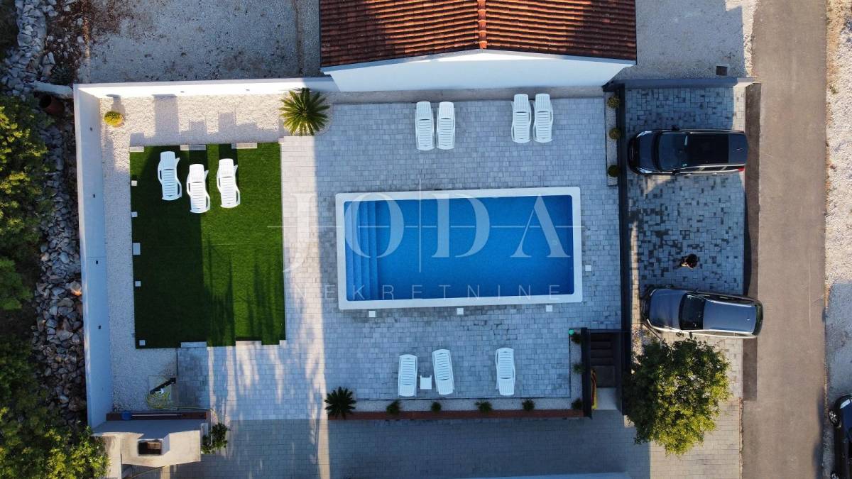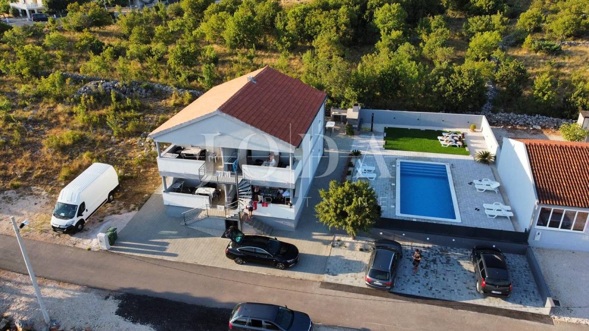 Kuća ima četiri namještena apartmana. Apartmani su po 40m2 u prizemlju te 40m2 na katu + 10m2 galerije u kojima se nalaze ležajevi. Svaki apartman ima zaseban ulaz preko terase površine 10m2. Svi apartmani su namješteni modernim namještajem i svim potrebnim kućanskim aparatima (klima uređaj, TV, perilica posuđa, perilica rublja, pećnica ...) . Ispred se nalazi 6 parkirališnih mjesta. Dvorište je prostrano te se u njemu nalazi veliki vanjski kamin sa popratnim sadržajima, vrt i bazen. Bazen je dimenzija 9x4 metra obložen mozaik staklo-keramikom i velikim sunčalištem ukupne površine 200 m2.