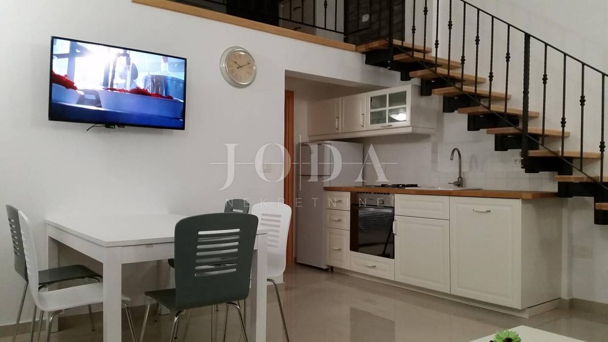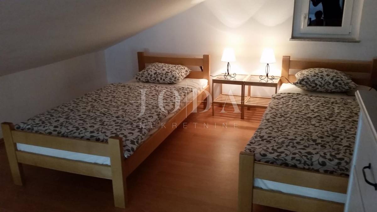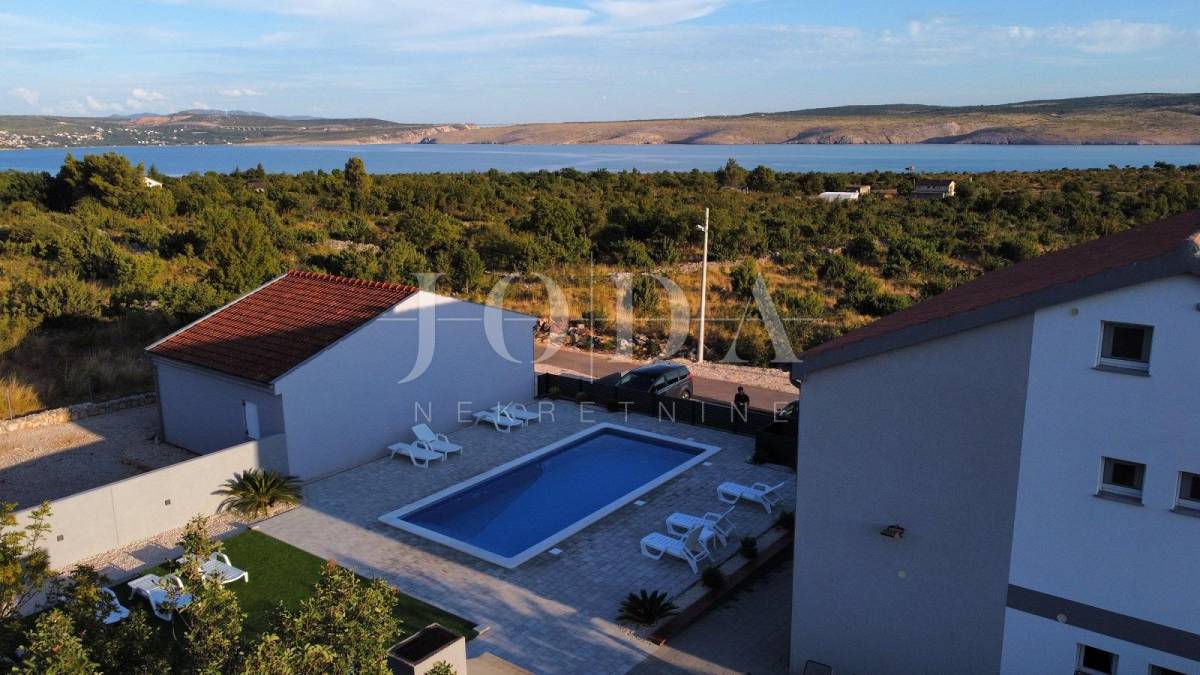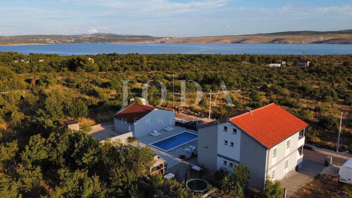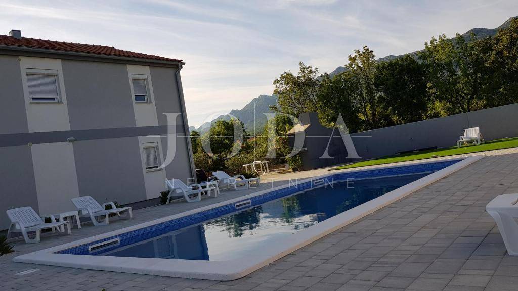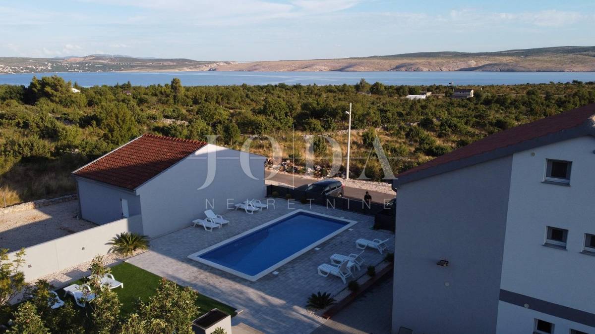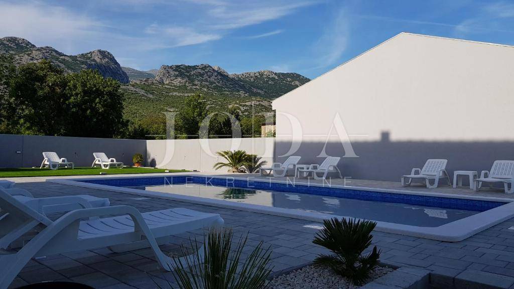 Kuća ima četiri namještena apartmana. Apartmani su po 40m2 u prizemlju te 40m2 na katu + 10m2 galerije u kojima se nalaze ležajevi. Svaki apartman ima zaseban ulaz preko terase površine 10m2. Svi apartmani su namješteni modernim namještajem i svim potrebnim kućanskim aparatima (klima uređaj, TV, perilica posuđa, perilica rublja, pećnica ...) . Ispred se nalazi 6 parkirališnih mjesta. Dvorište je prostrano te se u njemu nalazi veliki vanjski kamin sa popratnim sadržajima, vrt i bazen. Bazen je dimenzija 9x4 metra obložen mozaik staklo-keramikom i velikim sunčalištem ukupne površine 200 m2.