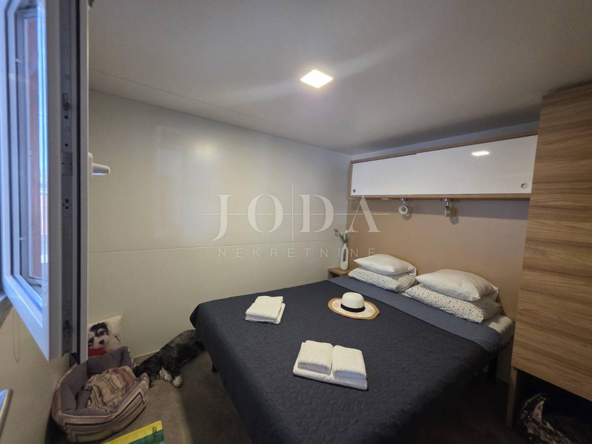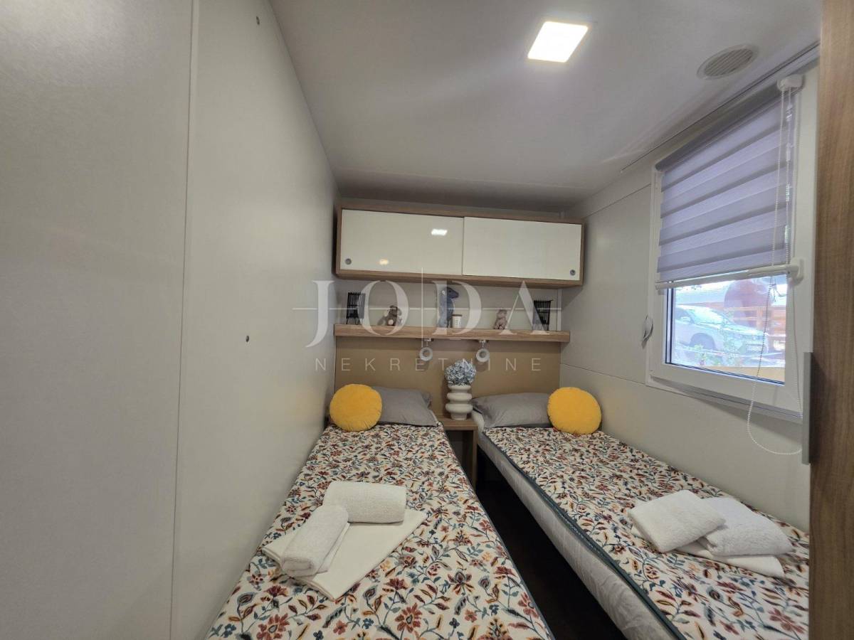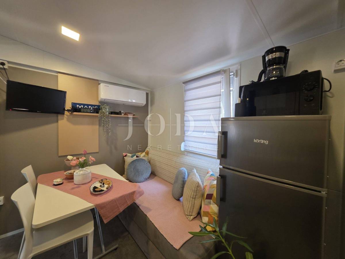 Prodajemo mobilnu kućicu u kampu. Kućica je u potpunosti namještena sa grijanjem/hlađenjem i spremna za korištenje. Sastoji se od dvije spavaće sobe, kuhinje,kupaone, natkrivene i ograđene terase. Unutarnje površine 3x8m2 te vanjske 2,5x6,5m2. Plaćen paušal (4000€+pdv) do 21.5.26. godine. Parking ispred kuće i ne plaća se. Ugovor sa kampom sklopljen na 4 godine.Struja/voda/smeće uključeno je u cijeni godišnjeg paušala, nema nikakvih drugih troškova. Blizina mora!