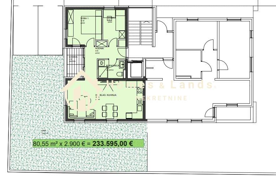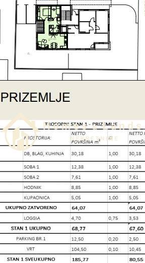 Trosoban stan S1 ukupne korisne površine 185,77m2 (obračunske 80,55m2) u prizemlju,sastoji se od ulaznog hodnika,kuhinje s blagovaonicom i dnevnog boravka,dvije spavaće sobe,kupaonice,loggie,velikog vrta 104m2 i vanjskog parkinga.