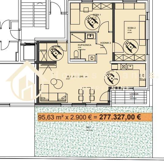 Trosoban stan S2 ukupne korisne površine 164,04m2 (obračunske 95,63m2)u prizemlju prilagođen osobama smanjene pokretljivosti i prilagođen njihovim potrebama s više okretnog prostora,širim ulazima u prostorije,te vanjskim prlazom.,sastoji se od ulaznog hodnika,kuhinje s blagovaonicom i dnevnog boravka,dvije spavaće sobe,kupaonice,loggie,velikog vrta i vanjskog parkinga.