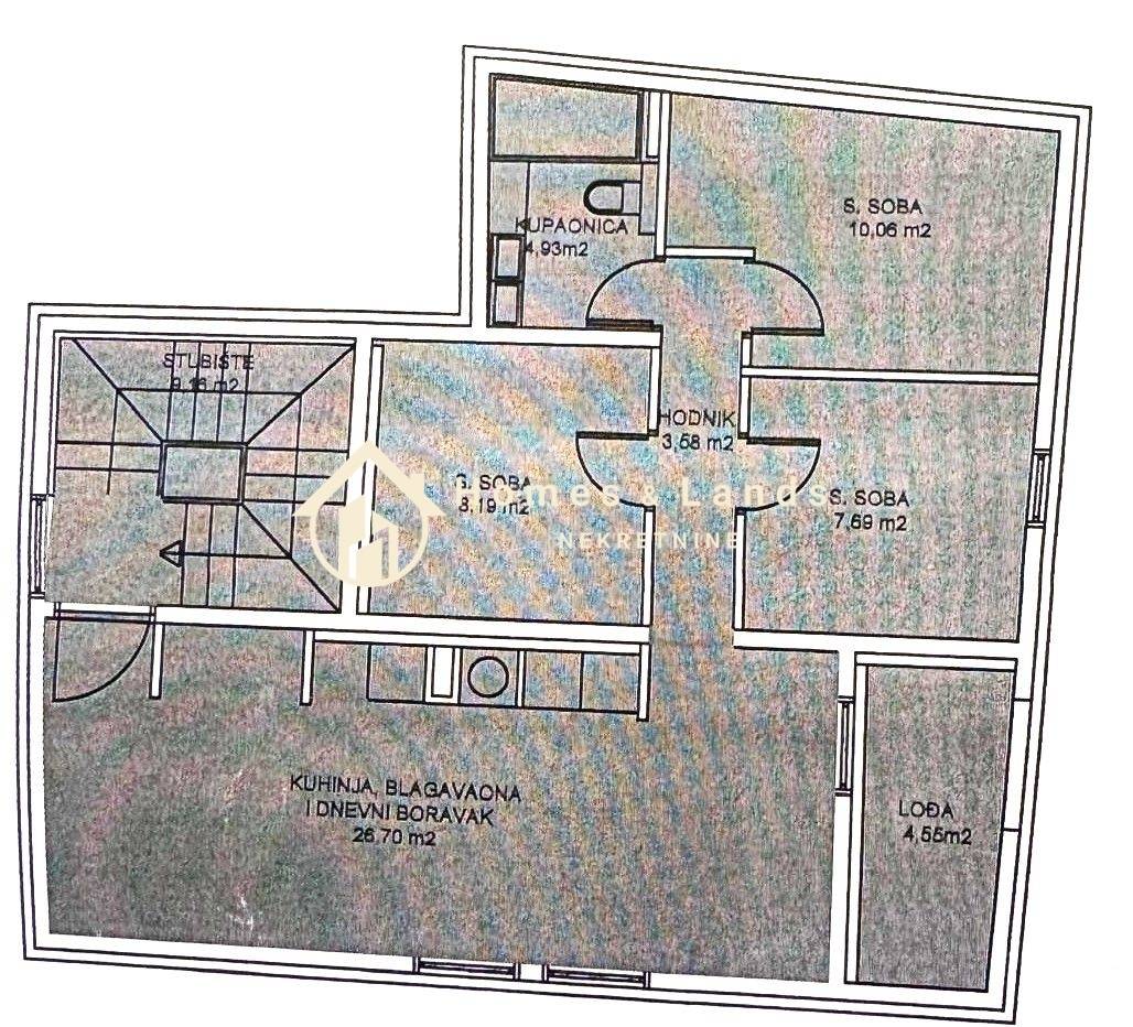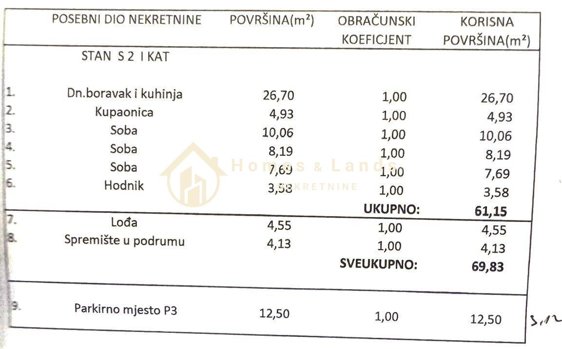 Četverosoban stan ukupne površine 82,33m2(obračunski 72,95m2, oznake S2Z4) sastoji se od ulaznog hodnika,kuhinje s blagovaonicom i dnevnog boravka,spremišta u podumu,kupaonice,loggie,tri spavaće sobe,hodnika i kupaonice i vanjskog parkinga.