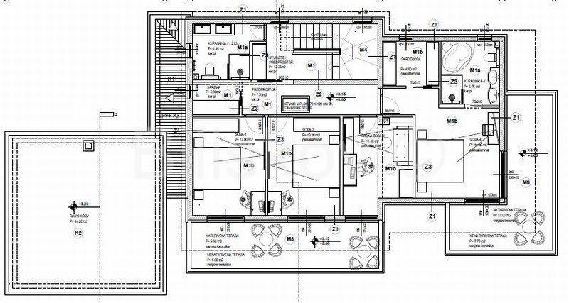 Na etaži kata je predviđena glavna soba sa kupaonicom, garderobom i terasom, te još tri sobe – sve imaju izlaz na jednu zajedničku terasu, te kupaonica.