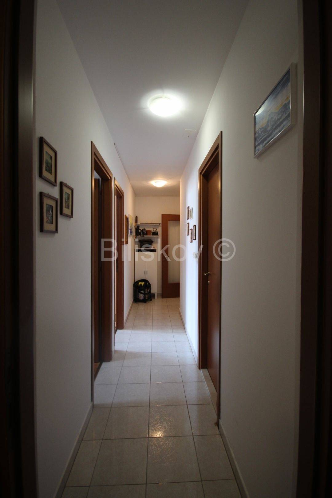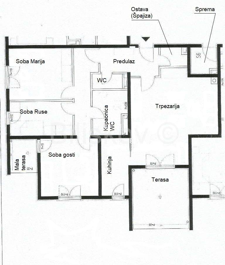 Stambena površina je 85m2, a sastoji se od ulaznog hodnika u kojem je WC i ostava, kuhinje, dnevnog boravka iz kojeg se izlazi na lođu površine 12m2, te drugim hodnikom odvojenog spavaćeg dijela u kojem su 3 spavaće sobe, kupaonica i lođa iz jedne sobe.