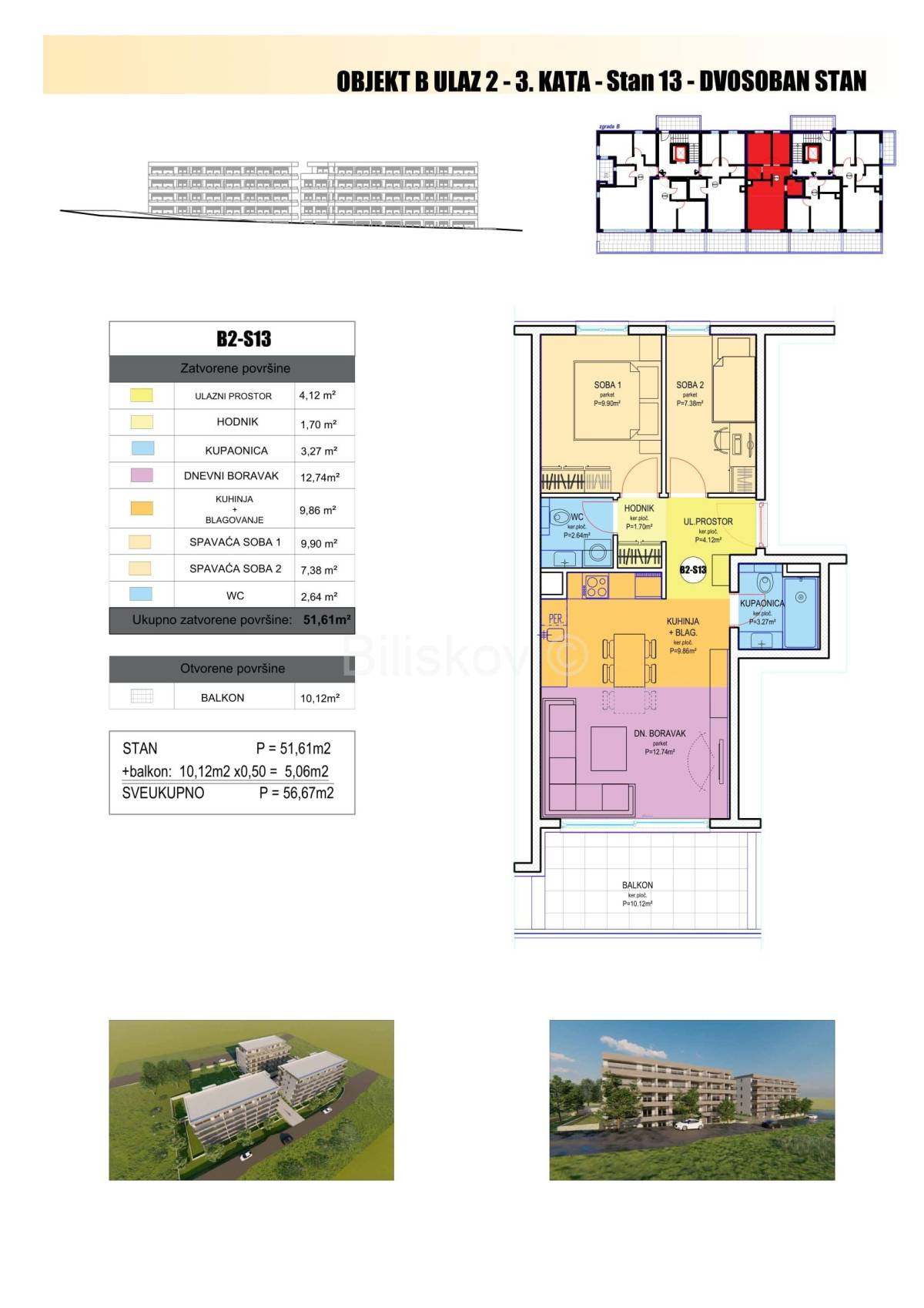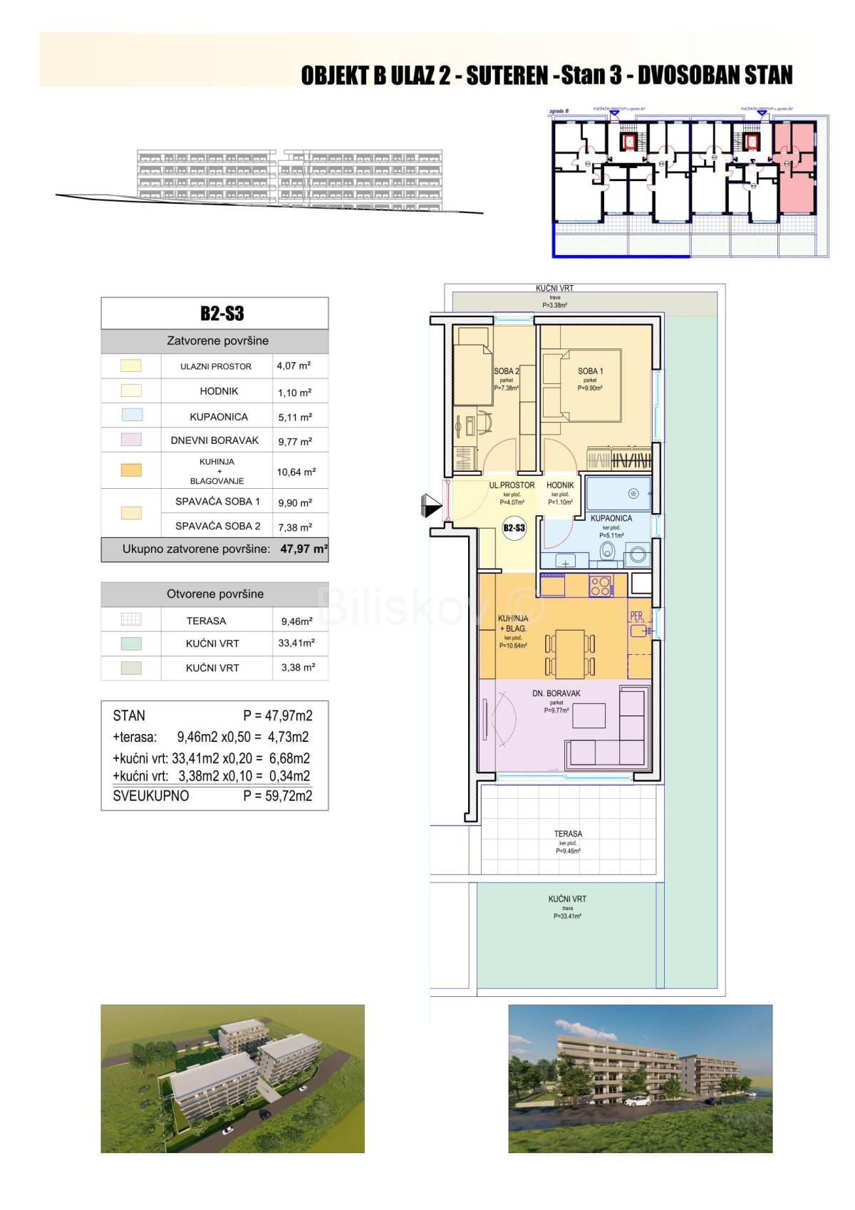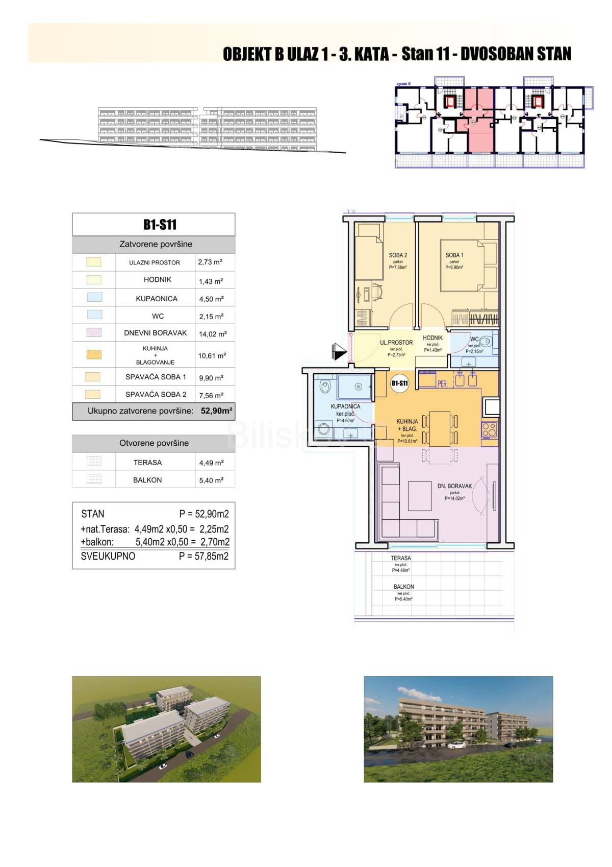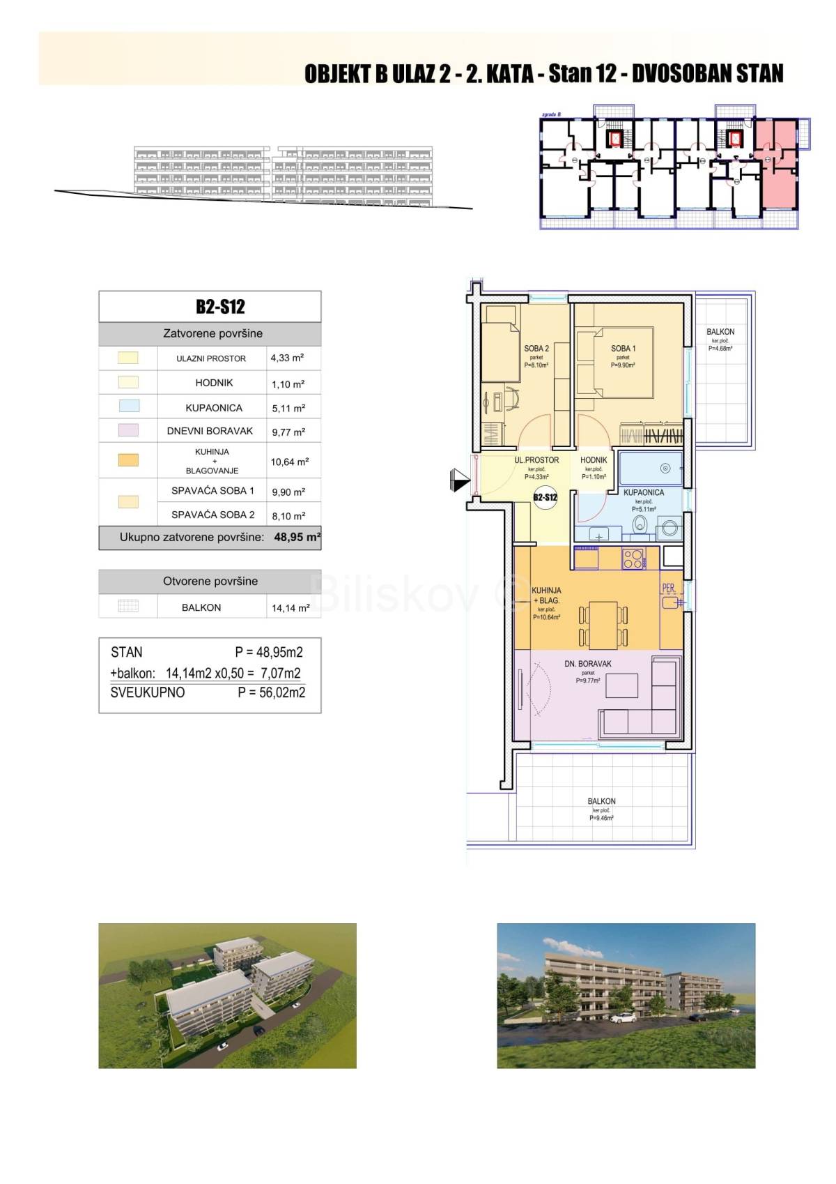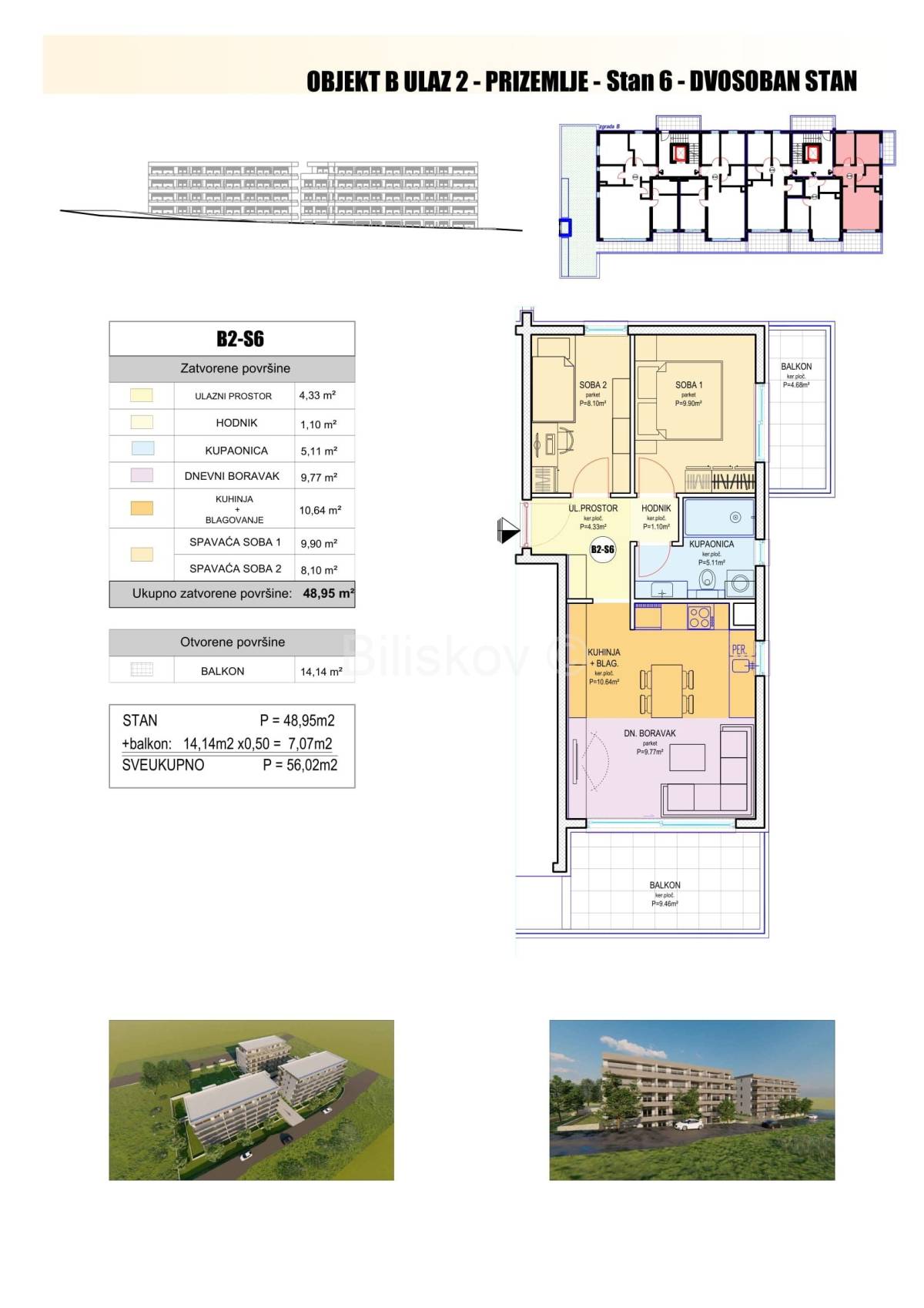 Split, Duilovo, prodaja, stanovi u izgradnji, 3 zgrade Posredujemo u prodaji stanova u 3 zgrade koje predstavljaju jedan kompleks. Osigurajte novogradnju po povoljnijoj cijeni od većine starih zgrada!! Početak radova do ljeta 2026., a rok za izgradnju je 30 mjeseci od početka radova. Dinamika plaćanja: 30% prilikom potpisivanja predugovora 40% po završetku betonske konstrukcije 30% po završetku fasade Sve 3 zgrade povezane su liftom iz dvije podrumske etaže s parkirnim mjestima i spremištima. Cijena parkirnih mjesta u zatvorenom podrumu iznosi 2.000 €/m2, vanjskih parkirnih mjesta 1.800 €/m2, a spremišta 2.200 €/m2. Zgrada B ima 2 ulaza s liftom, sastoji se od podruma, prizemlja i 3 kata, te nudi sljedeće stanove: B1-S11 2-sobni jug-sjever 57,85m2, 6.500€/m2 376.025€ B2-S3 2-sobni jugoistok-sjever 59,72m2, 4.800€/m2 286.656€ B2-S6 2-sobni jugoistok-sjever 56,02m2, 4.950€/m2,277.299€ B2-S9 2 spavaće sobe jugoistok-sjever 56,02m2, 5.300€/m2 296.906€
