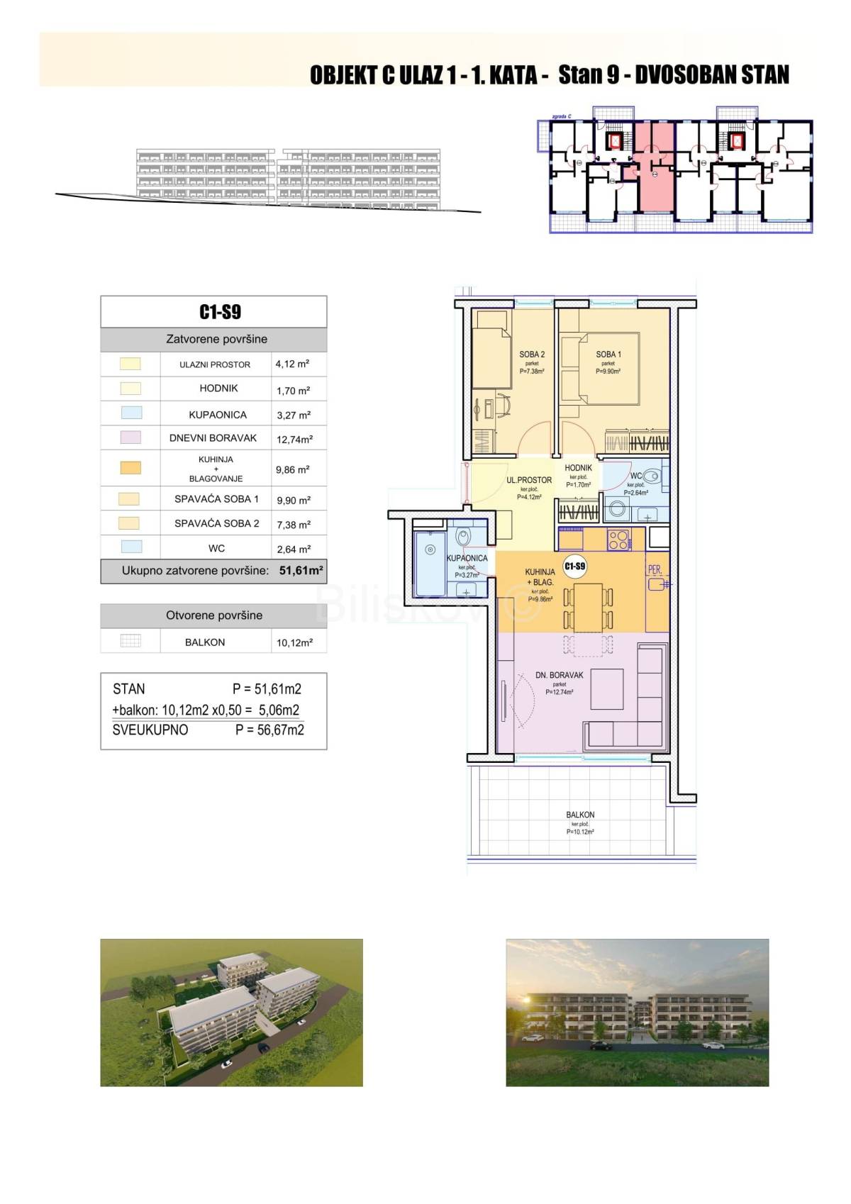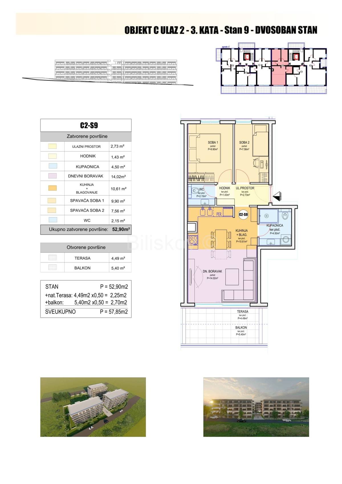 C2-S6 3-sobni jug-istok-sjever 93,98 5.500,00 516.890,00 €C2-S9 2-sobni jug-sjever 57,58 6.500,00 374.270,00 €