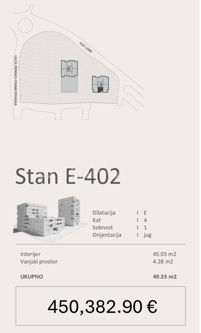 Stan E 402, površine 49,33 m2 nalazi se na četvrtom katu i sastoji se od spavaće sobe, kuhinje s blagovaonicom i dnevnim boravkom, kupaonice i lođe.