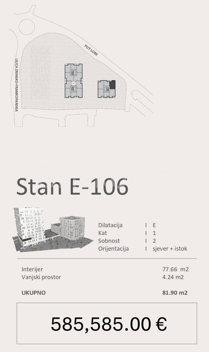 Stan E 106, površine 81,90 m2 nalazi se na prvom katu i sastoji se od 2 spavaće sobe, kuhinje s blagovaonicom i dnevnim boravkom, kupaonice, WCa i lođe.