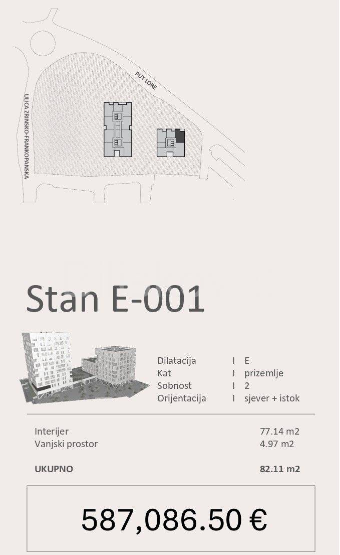 Stan E 001, površine 82,11 m2 nalazi se u prizemlju i sastoji se od 2 spavaće sobe, kuhinje s blagovaonicom i dnevnim boravkom, kupaonice, WCa i lođe.