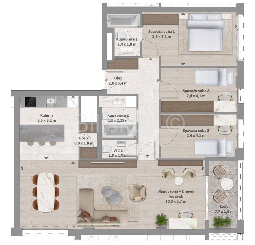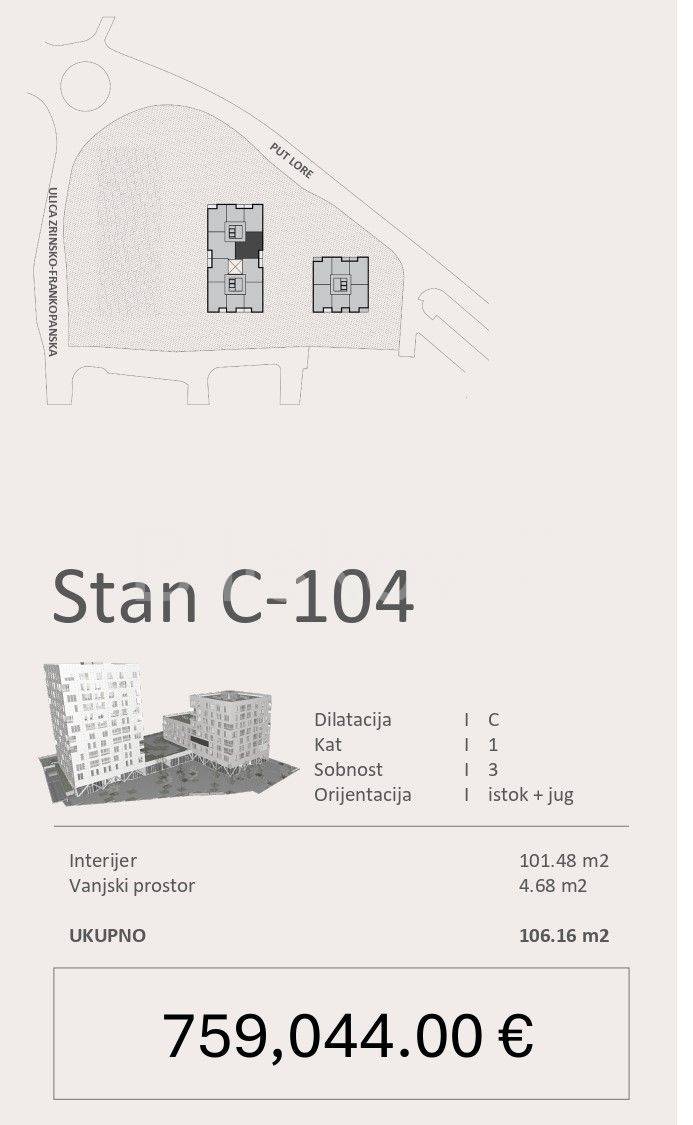 Stan C 104, površine 106,16m2 nalazi se na prvom katu i sastoji se od 3 spavaće sobe, kuhinje s blagovaonicom i dnevnim boravkom, dvije kupaonice, WCa i lođe.