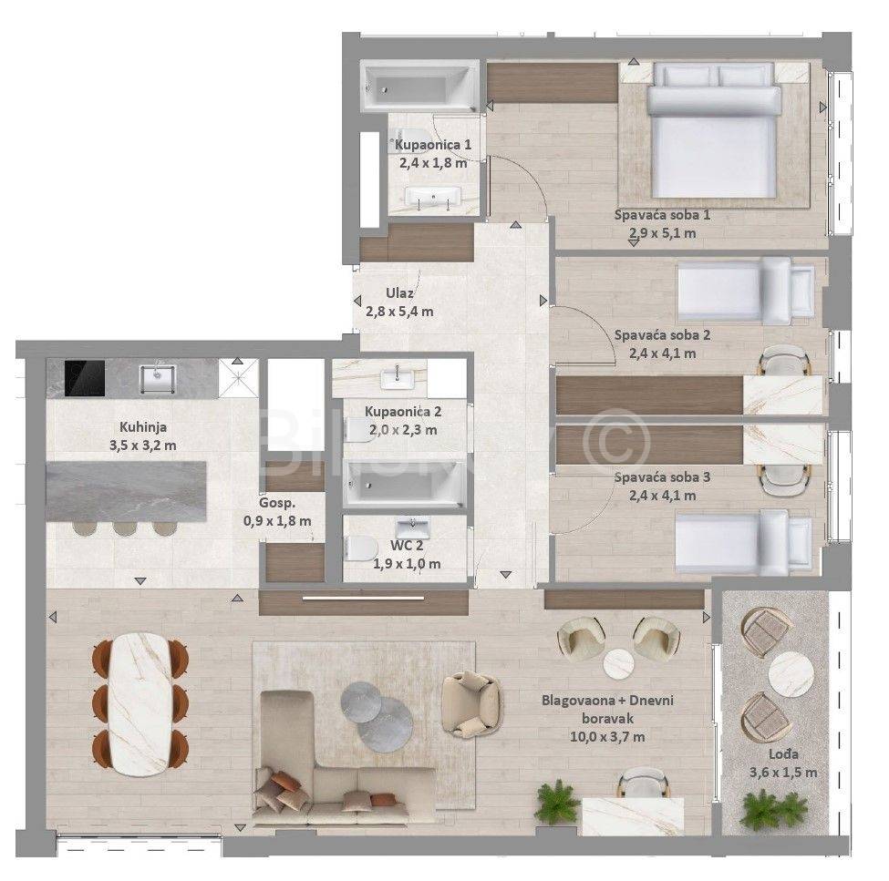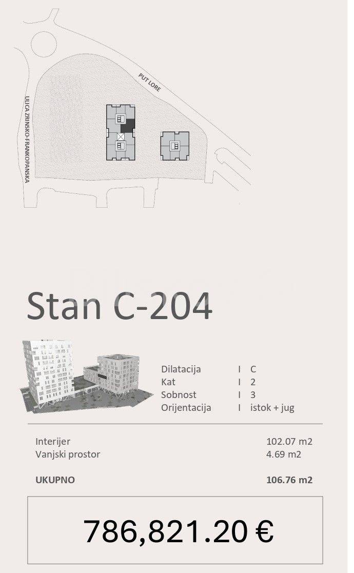 Stan C204, površine 106,76m2 nalazi se na drugom katu i sastoji se od 3 spavaće sobe, dvije kupaonice, kuhinje s blagovaonicom i dnevnim boravkom i lođe.