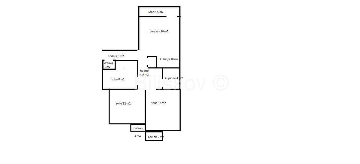 Sastoji se od kuhinje, blagovaonice s dnevnim boravkom, tri spavaće sobe, ostave, kupaonice, wc-a, predsoblja, hodnika, lođe i dva balkona.