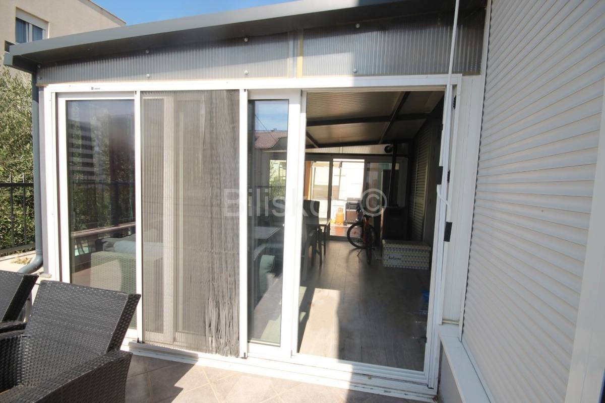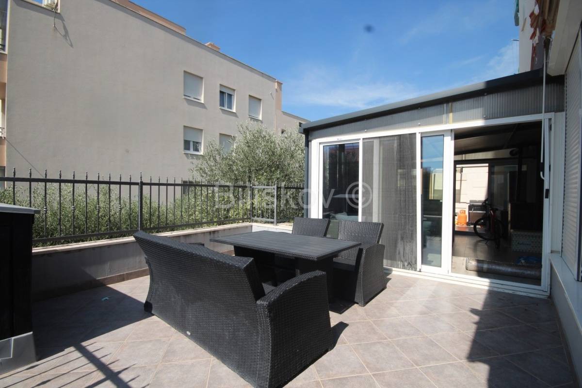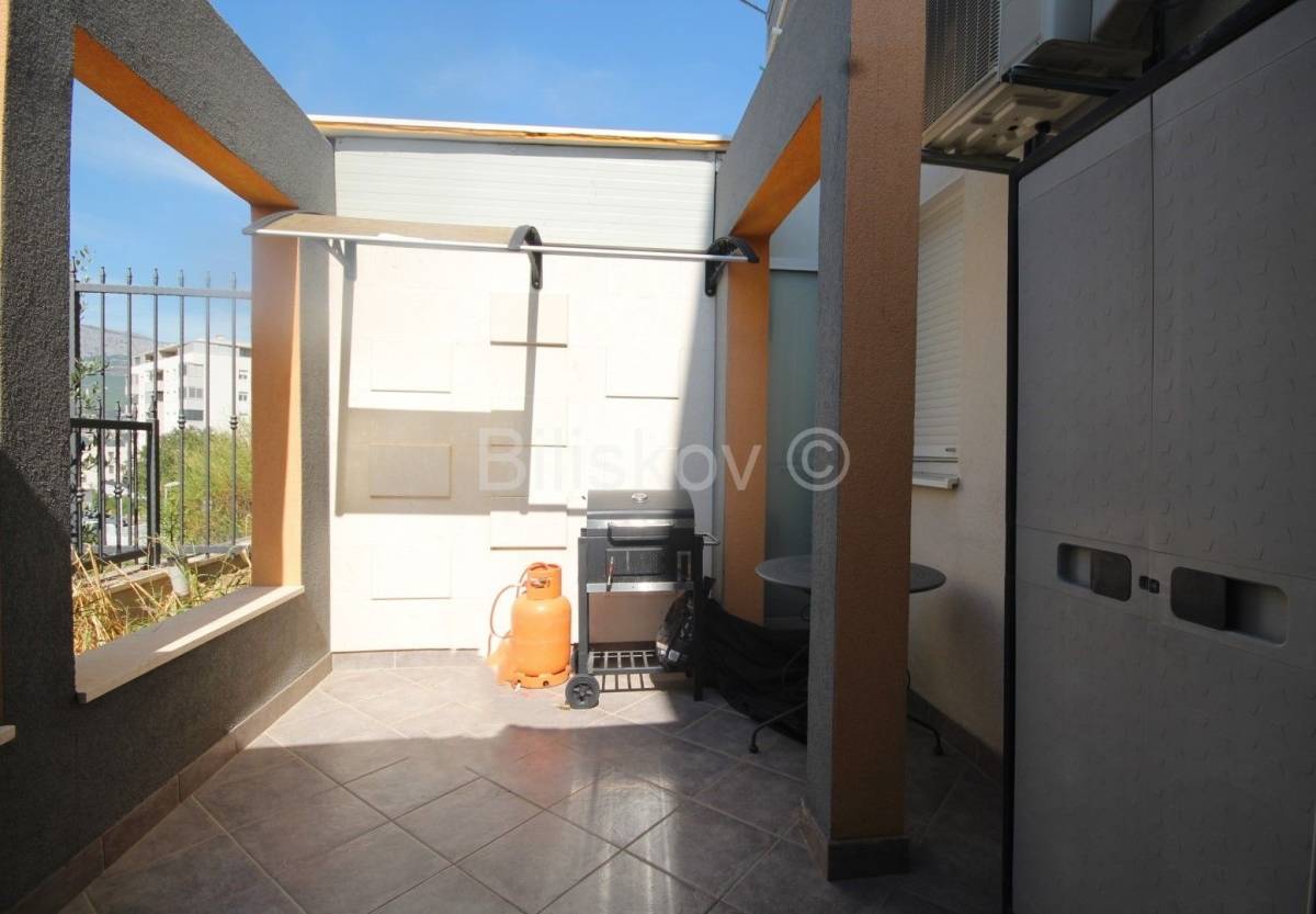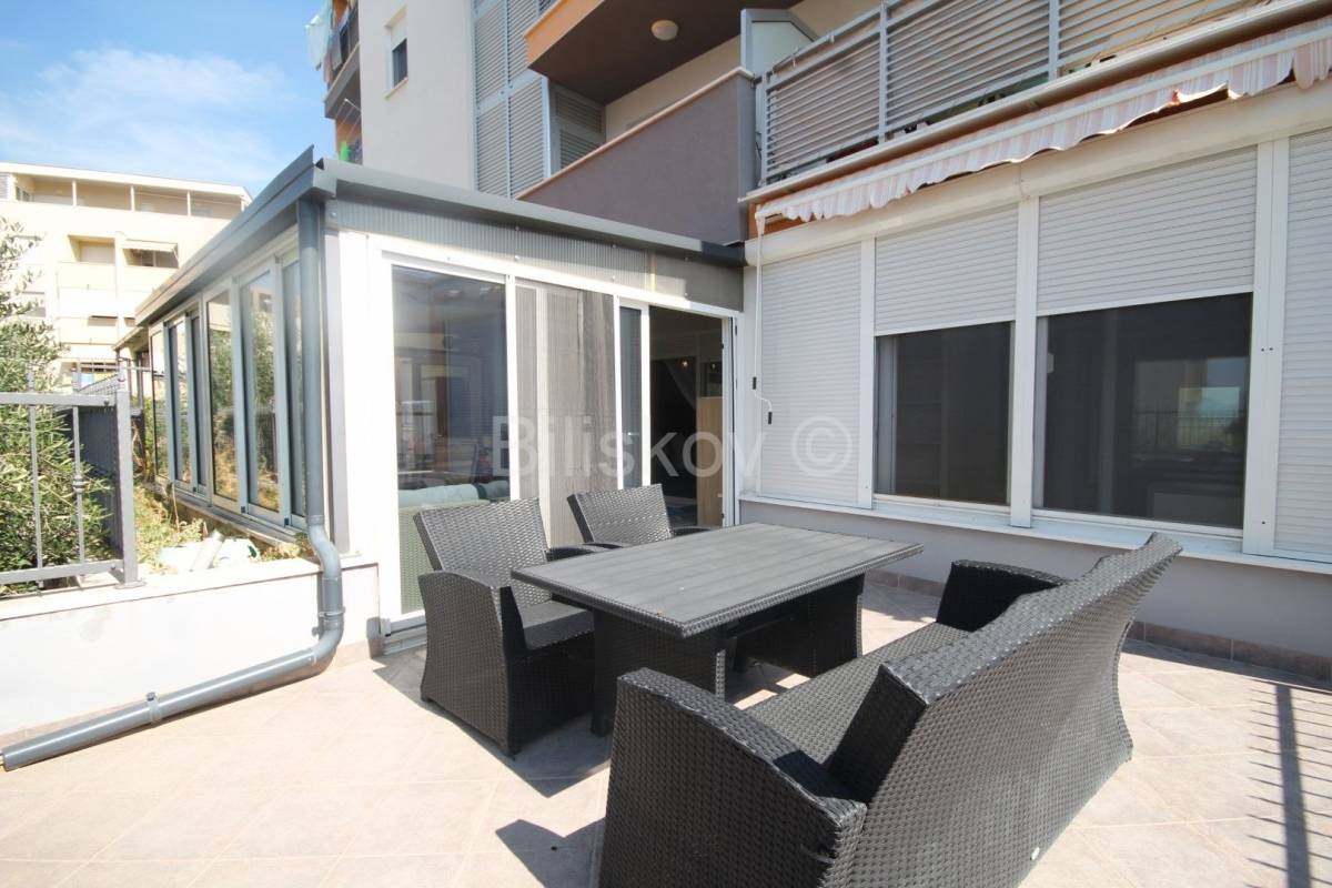 Split, Mejaši, trosoban stan površine 80m2 na visokom prizemlju stambene zgrade, sa ostakljenom verandom površine 22m2 iz koje se izlazi na dvije terase. U cijenu su uključena i 2 vanjska parkirna mjesta, svako površine 13m2.