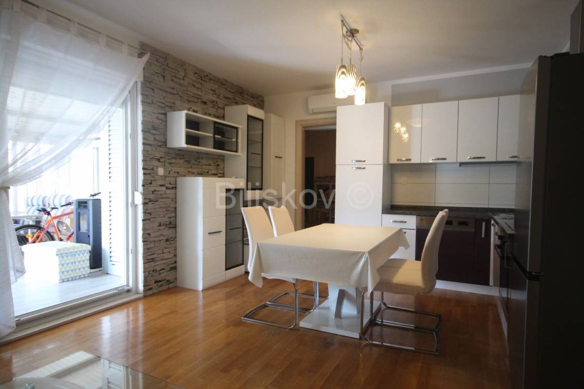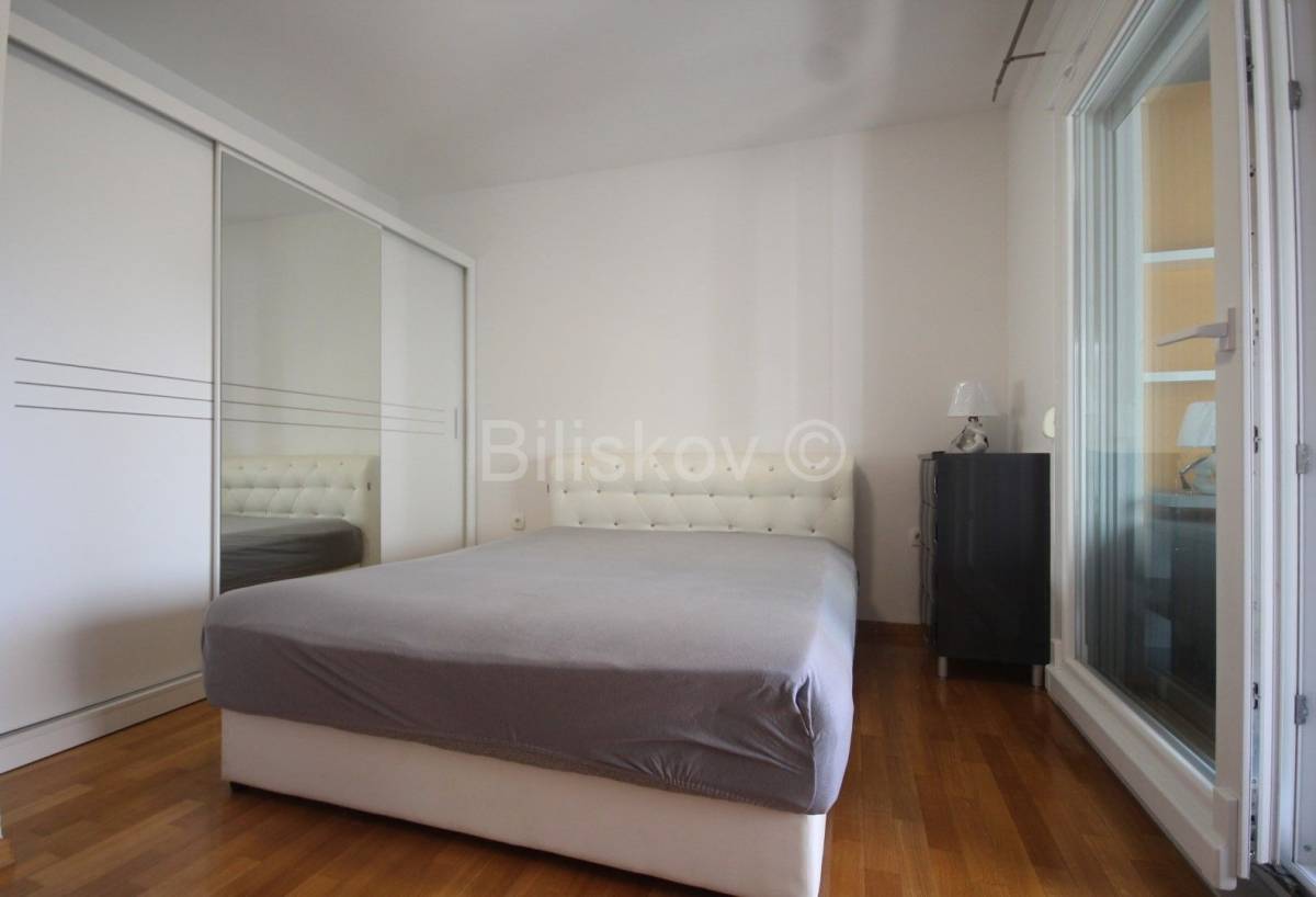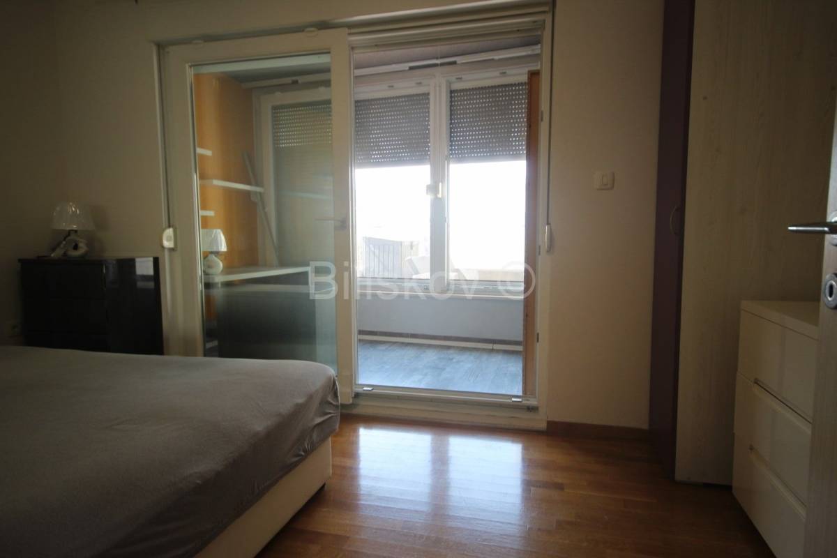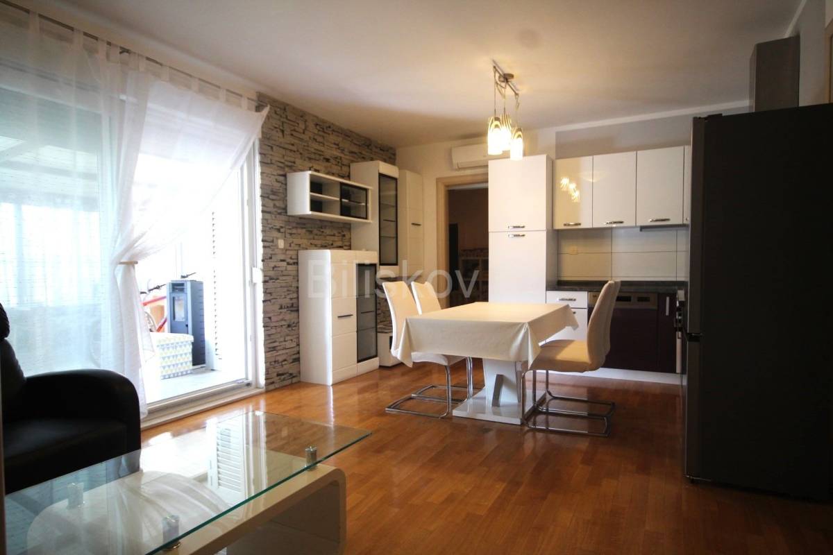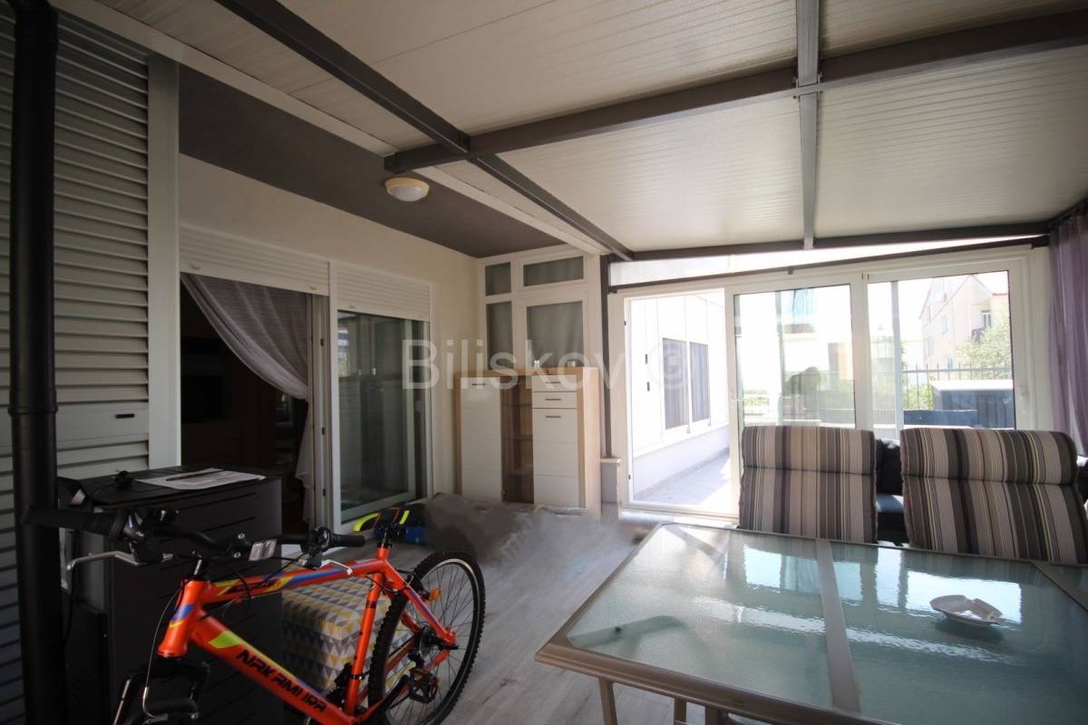 Raspored stana je odličan. U ulaznom hodniku je ugradbeni ormar i kupaonica. Dnevni boravak i kuhinja su središnji prostor strana i iz njega se izlazi na ostakljenu verandu površine 22m2 koja se koristi kao drugi dnevni boravak. S obje strane verande su terase: južna površine 20m2 na kojoj je dodatna garnitura za sjedenje, a na sjevernoj se nalazi roštilj. Iz dnevnog prostora se ulazi u spavaće sobe: jedna na zapadu, i dvije na jugu između kojih je druga kupaonica. Zapadna soba ima i zatvorenu lođu koja se može korisitit kao radna soba.