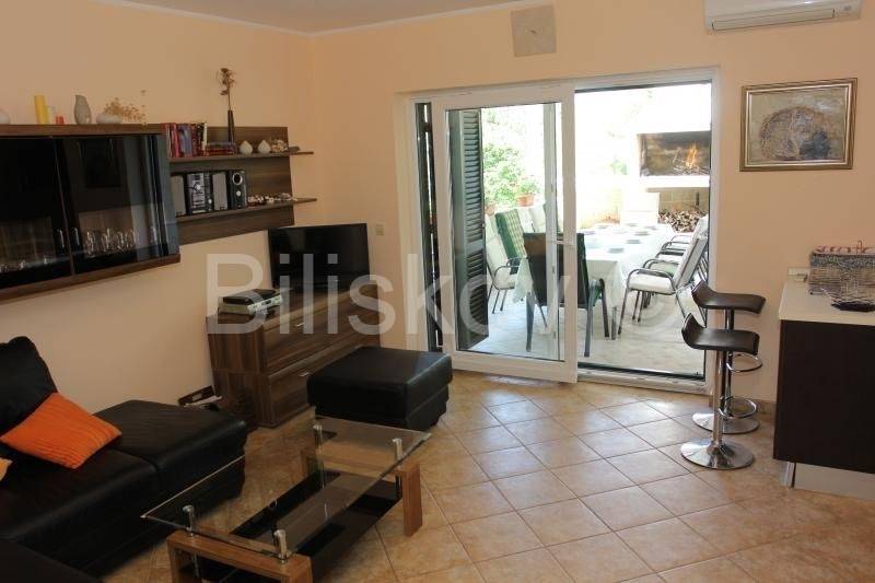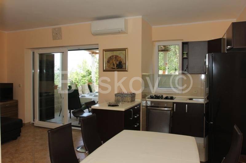 U prizemlju je dnevni boravak s kuhinjom i blagavaonicom s izlazom na terasu, 2 spavaće sobe i 2 kupaonice.