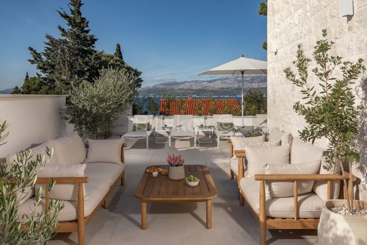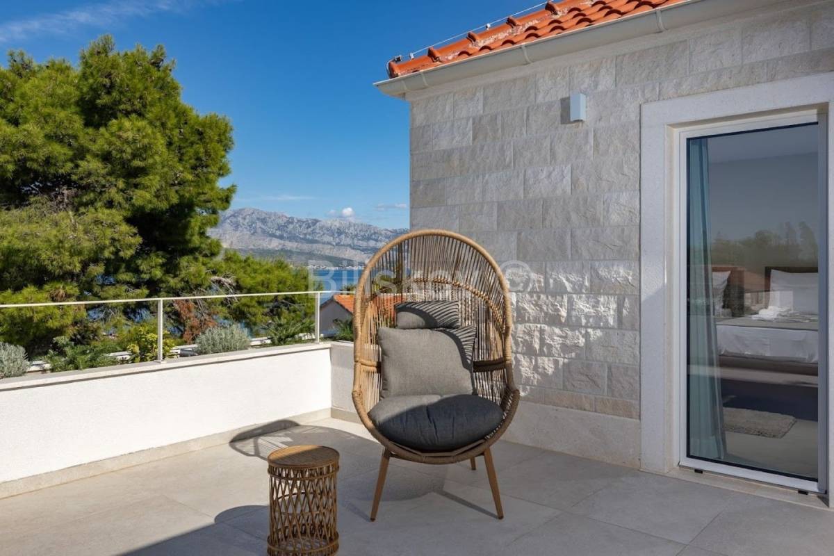 Kuća ima prekrasno uređenu terasu s mnogo bračkog kamena. Izgrađena je u dalmatinskom stilu.